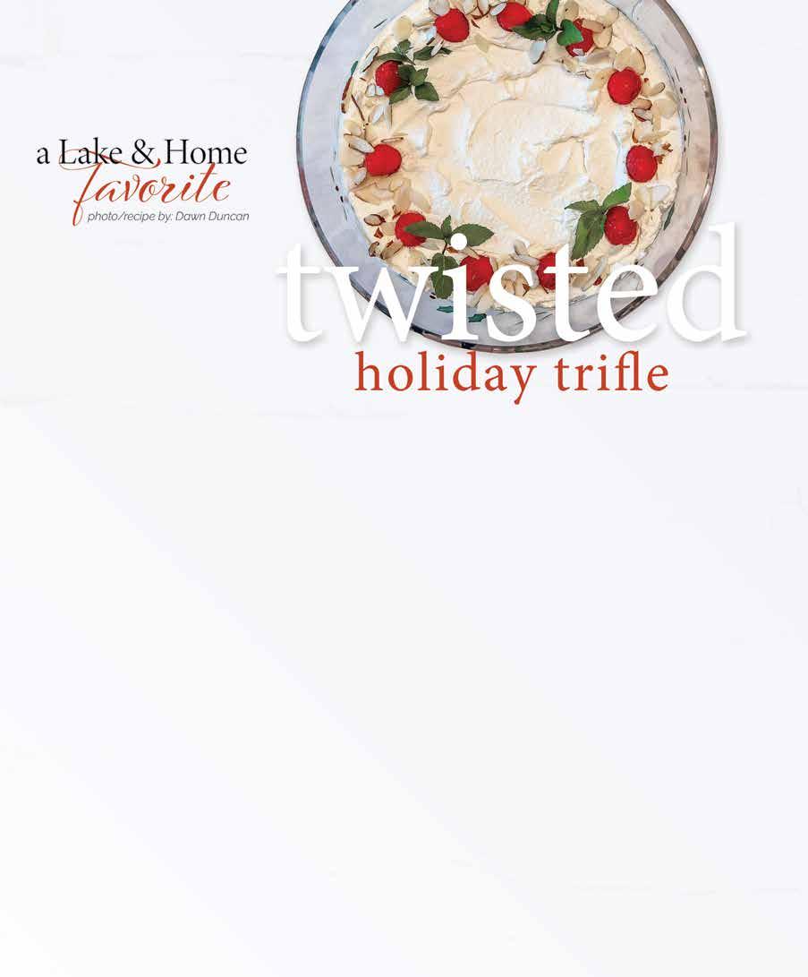 a large bowl. Whip on high speed until you see “peaks” form. Spread the crème fraiche over the top of the trifle carefully and then garnish with berries, mint, nuts, etc. as desired. Trifle is best when chilled for 3+ hours, covered. To serve, use shallow dessert bowls and scoop trifle (it’s not a dessert that remains “intact” like cake, so it will have creamy consistency mixed with the cake and berries). Store refrigerated up to 3 days. L&H