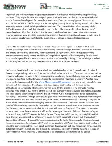 Let’s take a hypothetical situation where a building jurisdiction has adopted a wind speed of 130 mph three-second-gust design wind speed for structures built in that jurisdiction. There are various methods to convert wind speeds between different averaging times, and many factors that may need to be considered when doing that. One method for converting is the Durst method referenced in ASCE 7. Another more recent method recommended by the World Meteorological Organization provides a pretty straightforward conversion between sustained wind speed and three-second-gust wind speeds for near-surface applications. So for the sake of simplicity, we will use it for this example. If we convert a reported sustained wind speed of 130 mph to a three-second-gust average wind speed using this method, it equates to a three-second-gust wind speed for Off-Sea of 160 mph (Off-Sea is appropriate for an approaching hurricane). The adopted130 mph three-second-gust wind speed converts to 105 mph sustained wind speed. This difference could lead individuals in the path of the storm to underestimate its severity if they are not aware of the difference between averaging intervals for wind speeds. They could see the sustained wind speed of 130 mph being reported by the weather service when the storm is over open water and assume that their structure, or structures in their jurisdiction, will stand up fairly well. This would be a serious underestimate, since those structures would need to be designed to resist a 160 mph three-second-gust wind speed using ASCE 7 in order for that to be true. To say that a different way, one might think that their structure was designed for a Category 4 storm (130 mph sustained), when in fact it was actually designed for a Category 2 storm (105 mph sustained) using the Saffir-Simpson scale. Hurricane Irma at its maximum sustained wind speed of 185 mph would equate to a 227 mph three-second-gust wind speed using this conversion method. From a roof anchorage, lateral design and load path design perspective, the difference between 130 mph and 160 mph can be substantial, especially when the building is located on flat open terrain where Exposure C or Exposure D are appropriate assumptions for the design.