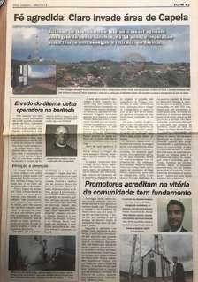 de Dom Joaquim, Minas gerais, com a manchete: Fé agredida: Claro invade área de Capela; do lado esquerdo, centralizado, fotografia de Dom Joaquim Silvério de Souza, em close, e a manchete: Enredo do dilema deixa operadora na berlinda; no canto inferior direito, duas fotografias, em cima, um homem de terno, em close, e logo abaixo, a fachada da capelinha Bom Jesus, com duas torres de transmissão à esquerda e a manchete: Promotores acreditam na vitória da comunidade: tem fundamento. A folha está centralizada na página, alinhada à direita.
