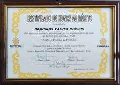 AUDIODESCRIÇÃO 1: Fotografia de três quadros com certificados honorários e honra ao mérito de Seu Domingos, emoldurados; dois certificados estão sobrepostos a uma faixa larga azul vertical.