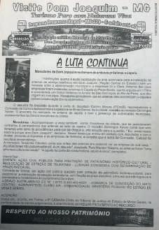 AUDIODESCRIÇÃO 2: Panfleto para mobilização da comunidade dom-joaquinense. Com formato retangular, fundo branco, imagens e textos escritos com letras de forma preta, tem a seguinte frase no cabeçalho: Visite Dom Joaquim – Minas Gerais; logo abaixo a manchete: A LUTA CONTINUA; no rodapé sobre uma tarja preta a frase: RESPEITO AO