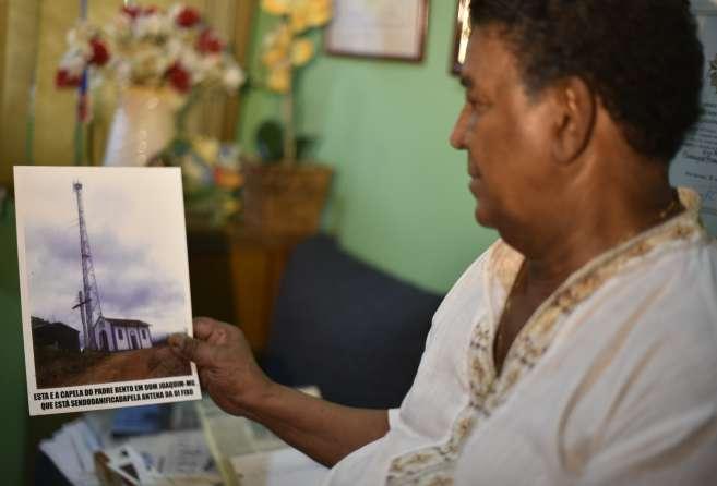 AUDIODESCRIÇÃO 1: Fotografia colorida de Domingos Xavier no meio da rua, à frente de uma multidão de pessoas em uma passeata, segurando duas faixas brancas, lado a lado, com dizeres em pró da defesa e respeito ao patrimônio público da cidade de Dom Joaquim, Minas Gerais, pedindo a relocação das antenas de transmissão de telefonia, instaladas ao lado da capela. Domingos usa camiseta branca de mangas curtas com uma estampa no peito. Ao fundo, casas dos dois lados da rua, uma palmeira bem alta, montanhas esverdeadas e céu azul com nuvens brancas.