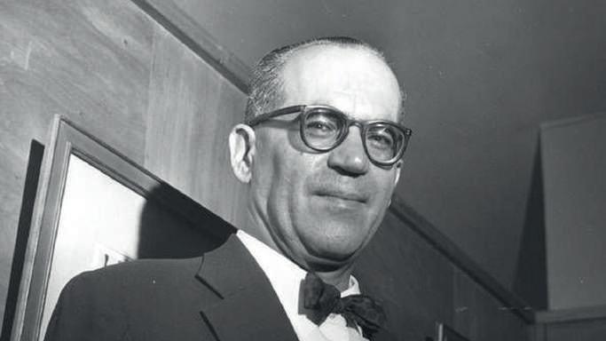 AUDIODESCRIÇÃO 1: Fotografia em preto e branco, tirada de baixo para cima, em primeiro plano (do peito para cima), do escritor João Guimarães Rosa. Ele é um homem branco com cabelos grisalhos bem curtos penteados para trás, com entradas, testa larga, olhos e boca pequenos. Usa paletó preto sobre camisa branca, gravata borboleta preta e óculos de grau com armação oval, preta. Atrás dele, ao fundo, a ponta de um quadro pendurado em uma parede de madeira escurecida e no alto o teto acinzentado.