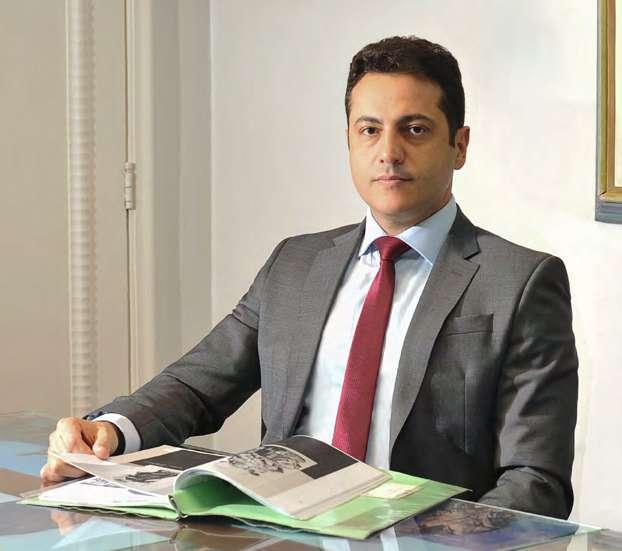 AUDIODESCRIÇÃO 3: Fotografia colorida de Marcelo Azevedo Maffra, promotor, sentado à mesa, segurando a folha de uma pasta arquivo de papel verde, aberta em cima da mesa com tampo de vidro, com olhar sereno. Ele usa paletó cinza desabotoado, sobre camisa branca e gravata bordô.
