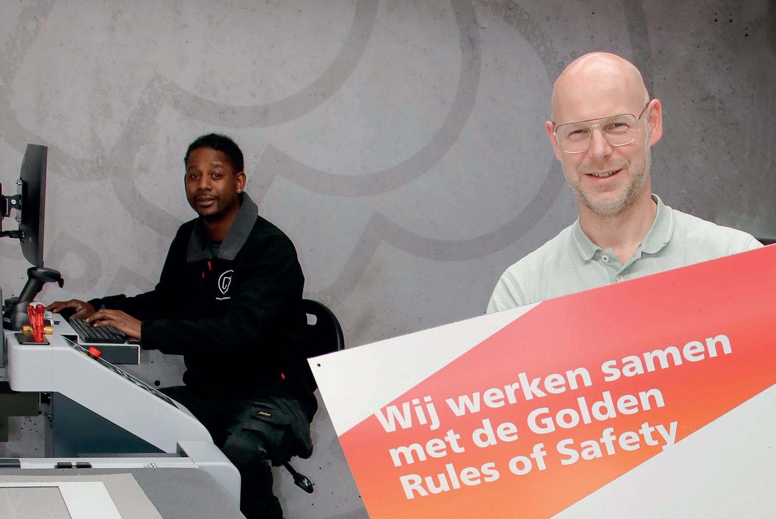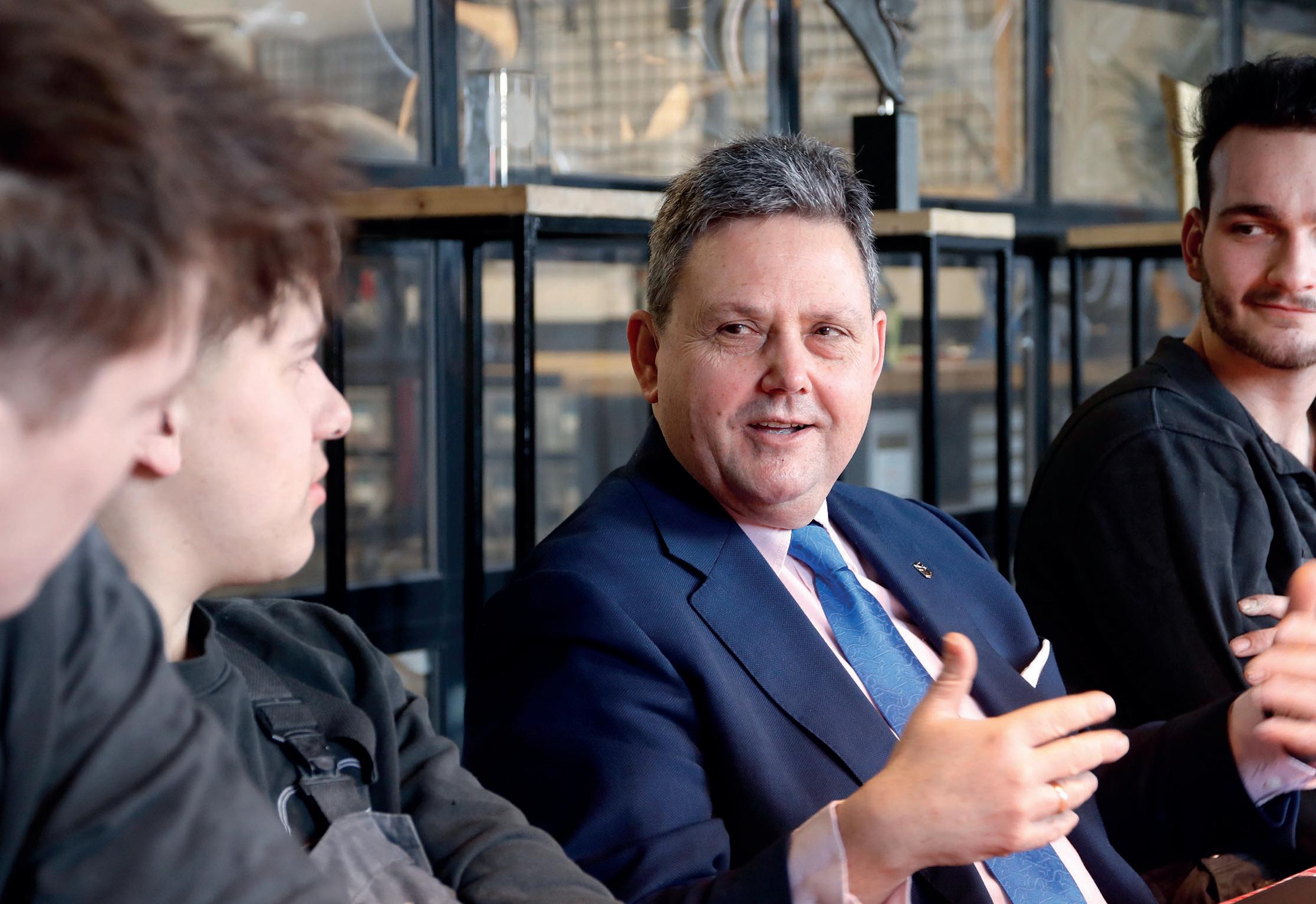 Chris Jansen tijdens een op bedrijfsbezoek in gesprek met werknemers.