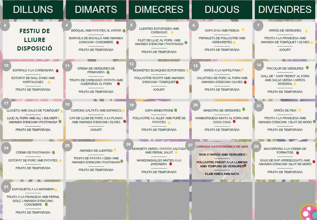 This menu may vary due to reasons beyond the school/AMPA. It can be downloaded from the website https://comtal.lasalle.cat/serveis/