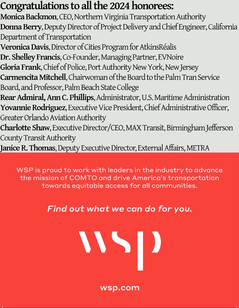 Inductees of the 2024 class of CWWMN honorees encompass a diverse spectrum of multi-modal transportation, spanning both the public and private sectors. This highly anticipated annual event uplifts women who positively contribute to the transportation industry, often quietly, not seeking recognition. The sold-out audience of transportation leadership in attendance is a true testament to the impact of these trailblazers who embody all that COMTO stands for, leadership reflecting the complex mosaic of those served.