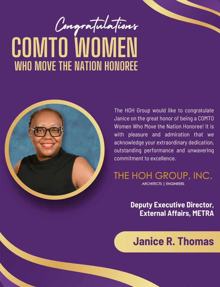 STV is thrilled to extend heartfelt congratulations to Janice R. Thomas for her recognition as a COMTO Women Who Move the Nation Honoree. We are immensely proud to contribute to Metra’s vision to provide regional rail service that supports sustainable connected communities.