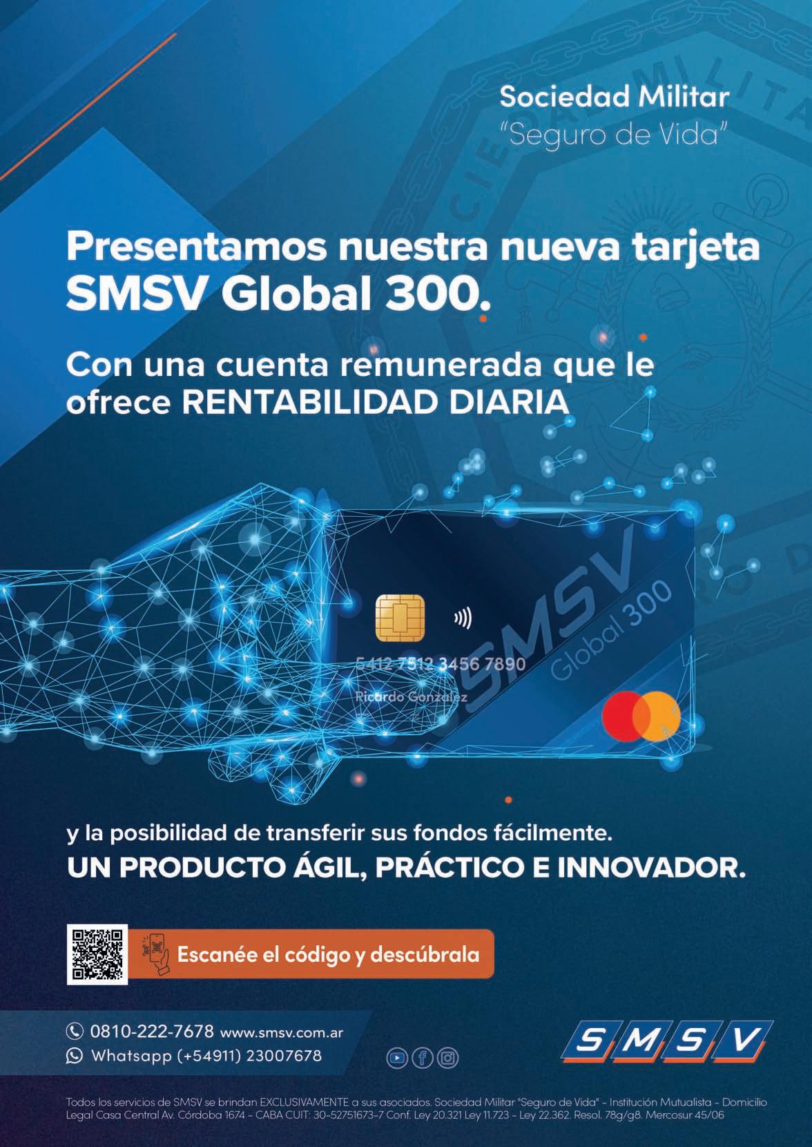 Para todos los que formamos parte de la Sociedad Militar Seguro de Vida, es una enorme alegría anunciar el lanzamiento de la nueva Tarjeta MasterCard SMSV GLOBAL 300, vinculada a una nueva cuenta de Ahorro Mutual remunerada. Este innovador y disruptivo producto representa un avance significativo para nuestra querida institución, mejorando sustancialmente la calidad de los servicios y beneficios que ofrecemos a todos nuestros asociados.