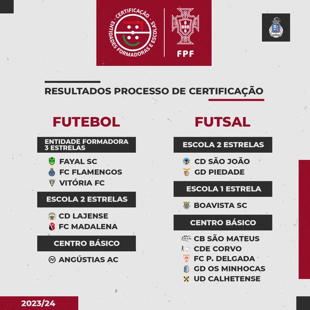 A Sub Comissão de Certificação da Associação de Futebol de Viana do Castelo informa que a Comissão Nacional de Certificação da Federação PortuguesadeFuteboljáemitiuosrelatóriosfinaisdefinitivos OsclubesAFVC jáconhecemasuacertificaçãodestaépoca Informamosqueemconjunto, conseguimosumcrescimentoexponencialde100%,demonstradonoaumento de 14 para 28 entidades formadoras Podemos afirmar que 65% dos clubes AFVCjásãoEntidadesFormadoras Nodistritotemosnofutebol22EntidadesFormadoras: 2CentrosBásicosdeFormação; 5EscolasdeFutebol1estrela(quatronomasculinoeumanofeminino); 5EscolasdeFutebol2estrelas; 8EntidadesFormadoras3estrelas; 2EntidadesFormadoras4estrelas NoFutsaltemos6EntidadesFormadoras: 3CentrosBásicosdeFormação(doisnomasculinoeumnofeminino); 2EscolasdeFutebol2estrelas(umanofemininoeumanomasculino); 1EntidadeFormadora3estrelas