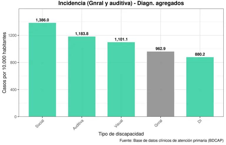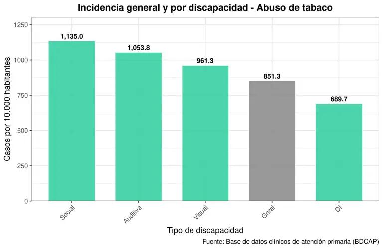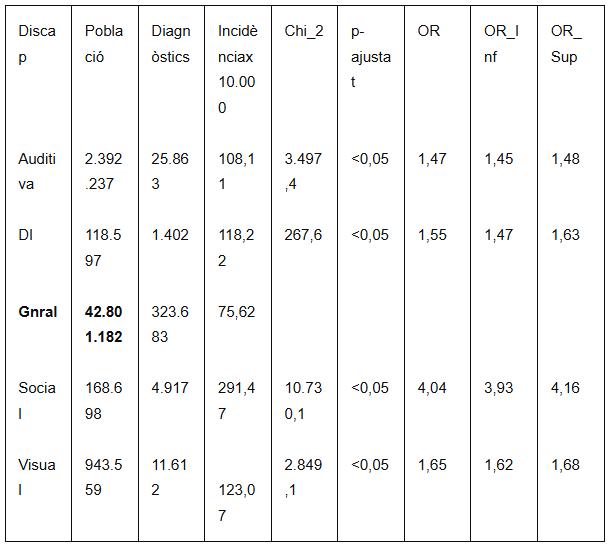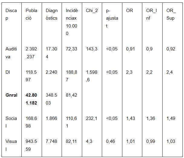 Podem observar que estadísticament totes les discapacitats presenten taxes diferents de la població general amb l’excepció de la visual. No obstant això, els riscos associats informen que són les discapacitats psicosocials i les intel·lectuals les que presenten un risc més gran. La resta es poden entendre properes a les de la pobla-