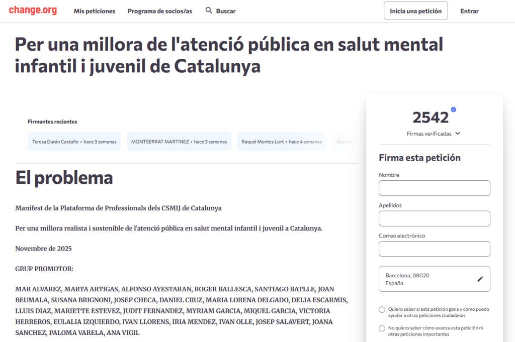 Els i les professionals responsables del manifest han obert una pàgina a Change.org perquè qualsevol persona pugui donar-hi suport i ajudar així a l’atenció a la salut mental d’infants i joves, i contribuir a fer possible el tan necessari canvi.
