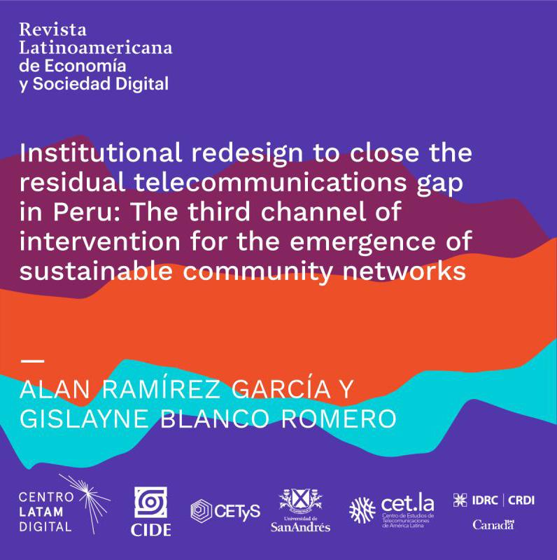 Ramírez García, Alan Alberto & Blanco Romero, Gislayne (2021) “Institutional redesign to close the residual telecommunications gap in Peru: The third channel of intervention for the emergence of sustainable community networks”, en Revista Latinoamericana de Economía y Sociedad Digital, Issue 2 DOI: 10.53857/ VHZY9461