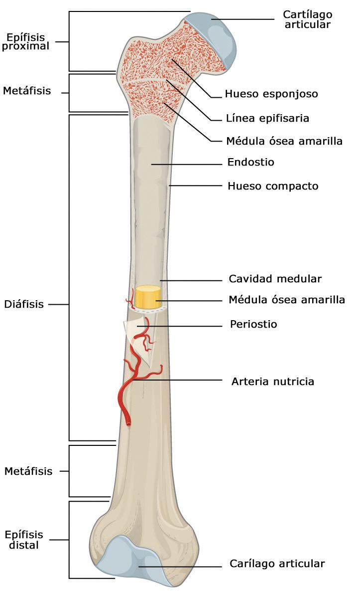 El tamaño de los huesos es muy variado; va desde el más largo, el fémur, que puede medir hasta 60 cm en una persona muy alta, hasta el más pequeño, un huesecito de la nariz que mide menos de un centímetro. Los huesos largos, formados por una zona central alargada y dos extremos llamados epífisis, son los relacionados con los grandes movimientos como correr, saltar o estirar los brazos. Ejemplo de este tipo de huesos son el fémur, el humero o la tibia.
