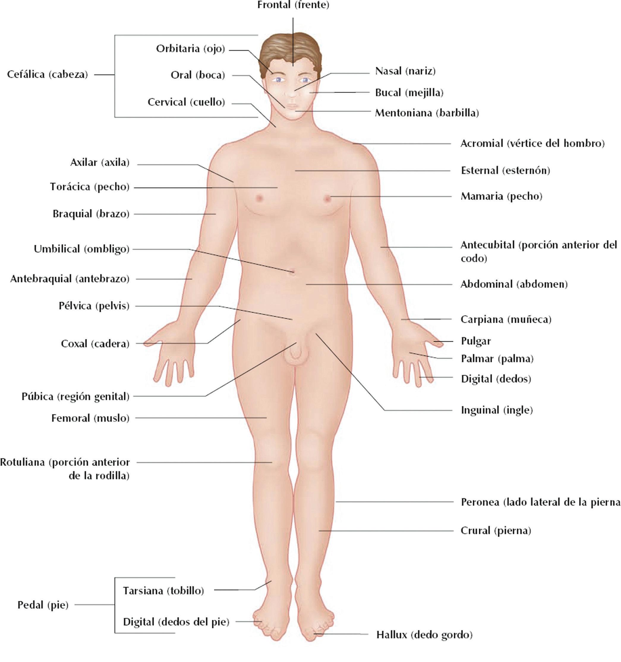 La figura siguiente nos permite apreciar a un ser humano en lo que denominamos la POSICIÓN ANATÓMICA BÁSICA, que está definida con el sujeto parado, con pies levemente separados –aproximadamente a la altura de los hombros-, la cabeza erguida posicionada en el llamado plano Frankfurt y los brazos extendidos a ambos lados del cuerpo, levemente separados del tronco, con las palmas de ambas manos mirando al frente y los dedos pulgares apuntando hacia fuera.