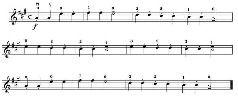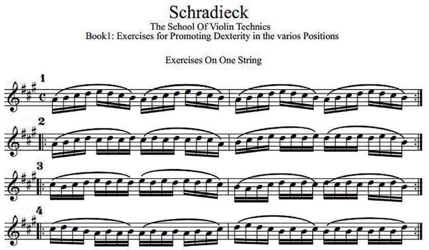 Para asegurarse de que la mano izquierda desde el principio adopte una posición en la que el cuarto dedo también se pueda colocar fácilmente en la cuerda, las cinco notas deben tocarse ascendiendo lentamente antes de cada ejercicio y melodía. Todos los ejercicios deben practicarse primero sin el arco.