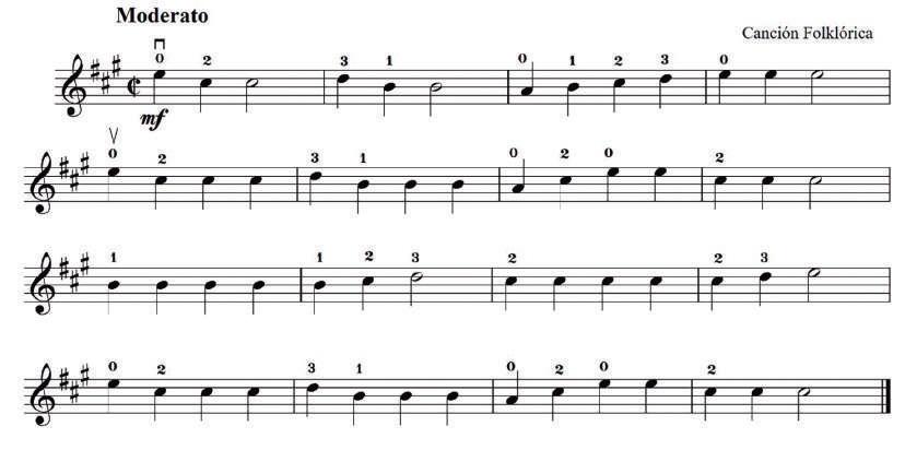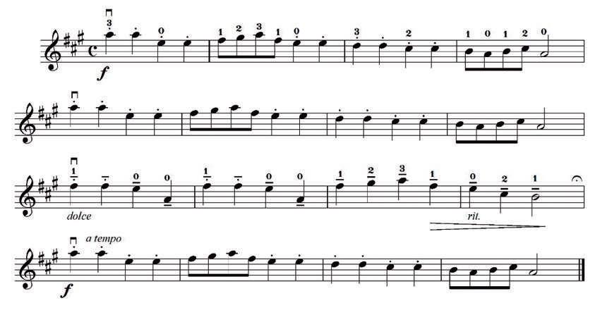 El segundo violín toca la melodía una cuerda (Una quinta) más abajo y empieza cuando el primer violín llega a 2. Terminando el signo calderón, mismo que no tiene relevancia para el primer violín. El estudiante debe practicar ambas partes.