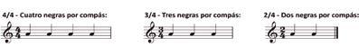 Por lo tanto un compás de 4/4 estará compuesto por cuatro negras o por cualquier combinación de figuras rítmicas que sea equivalente a cuatro negras; un compás de 3/4 por 3 negras, etc.