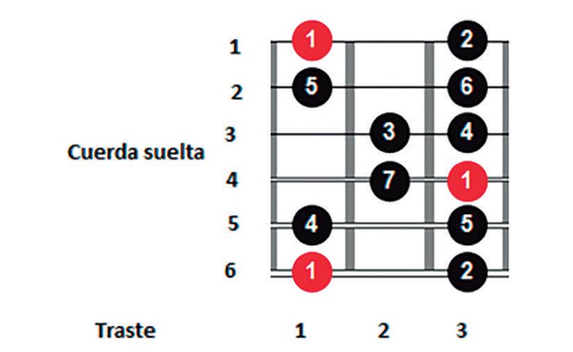 El número 1 en rojo, singnifica que esa nota es la TÓNICA, es decir la primera nota de la escala, en este caso es la nota “sol”. Ten en cuenta que algunas cuerdas sueltas tambien son parte de la escala. Los demás