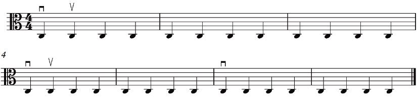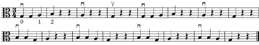 Así es que en un compás de 4/4 estaremos escuchando el pulso fuerte cada 4 pulsos, en uno de 3/4 cada 3, y en uno de 2/4 cada 2.