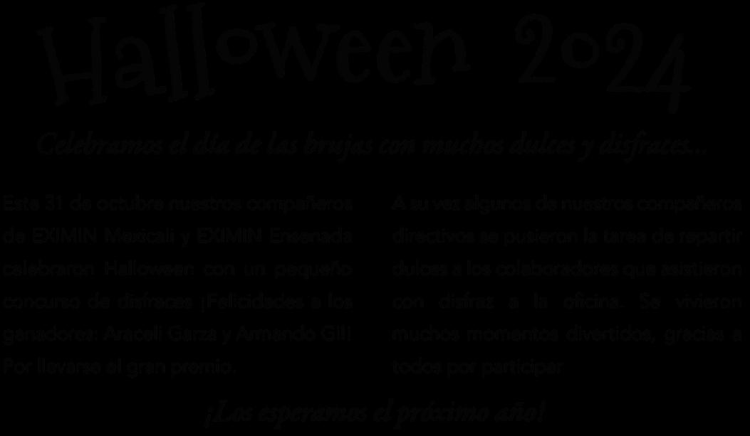 Este 31 de octubre nuestros compañeros de EXIMIN Mexicali y EXIMIN Ensenada celebraron Halloween con un pequeño concurso de disfraces ¡Felicidades a los ganadores: Araceli Garza y Armando Gil! Por llevarse el gran premio.