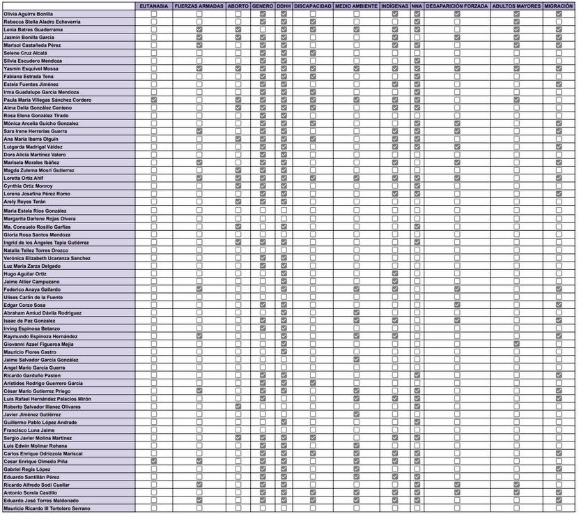 Nos hicimos diversos cuestionamientos sobre las y los aspirantes para guiar nuestro análisis: ¿Han ocupado algún cargo relacionado con cualquiera de las materias? ¿Tienen publicaciones en revistas, periódicos, libros o artículos de opinión? ¿Han votado a favor de algún proyecto relacionado? ¿Han participado en foros sobre el tema? ¿Se han especializado en la materia?