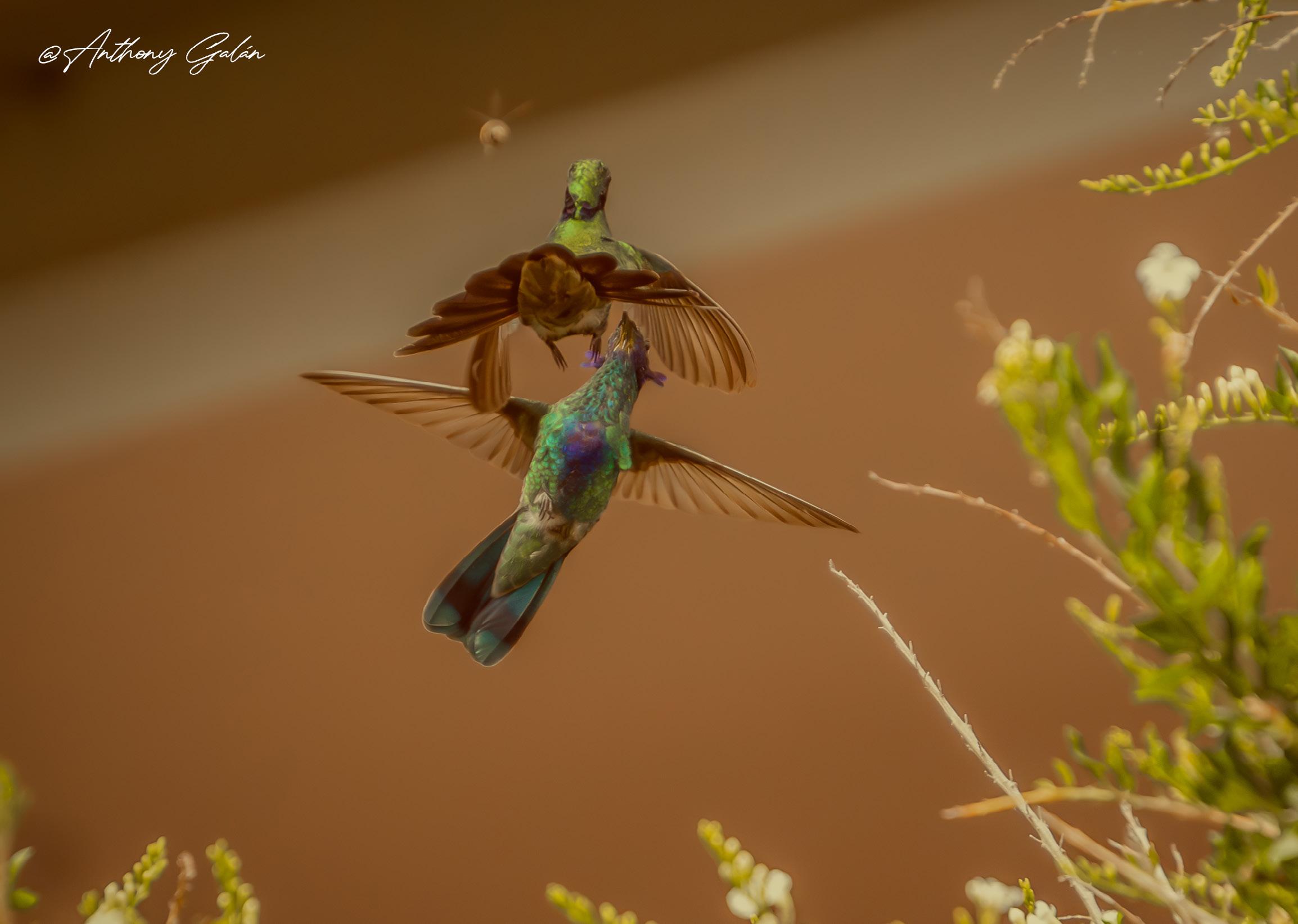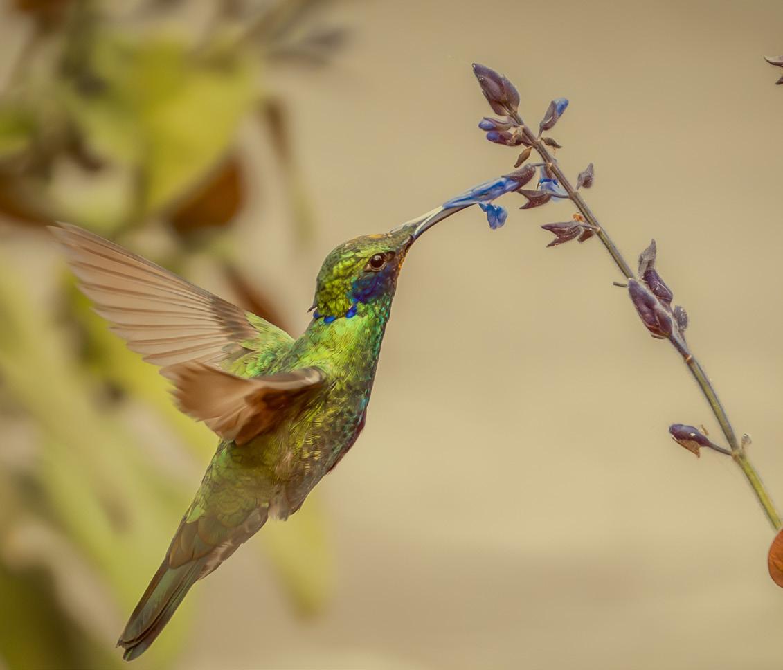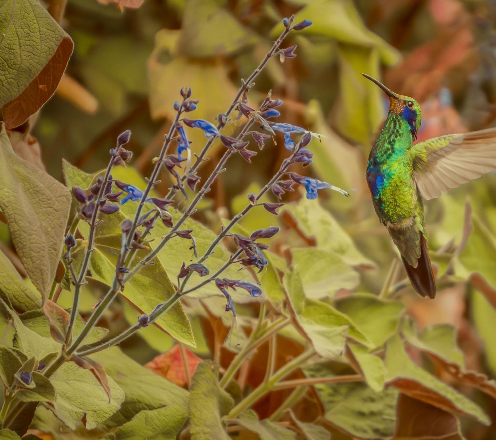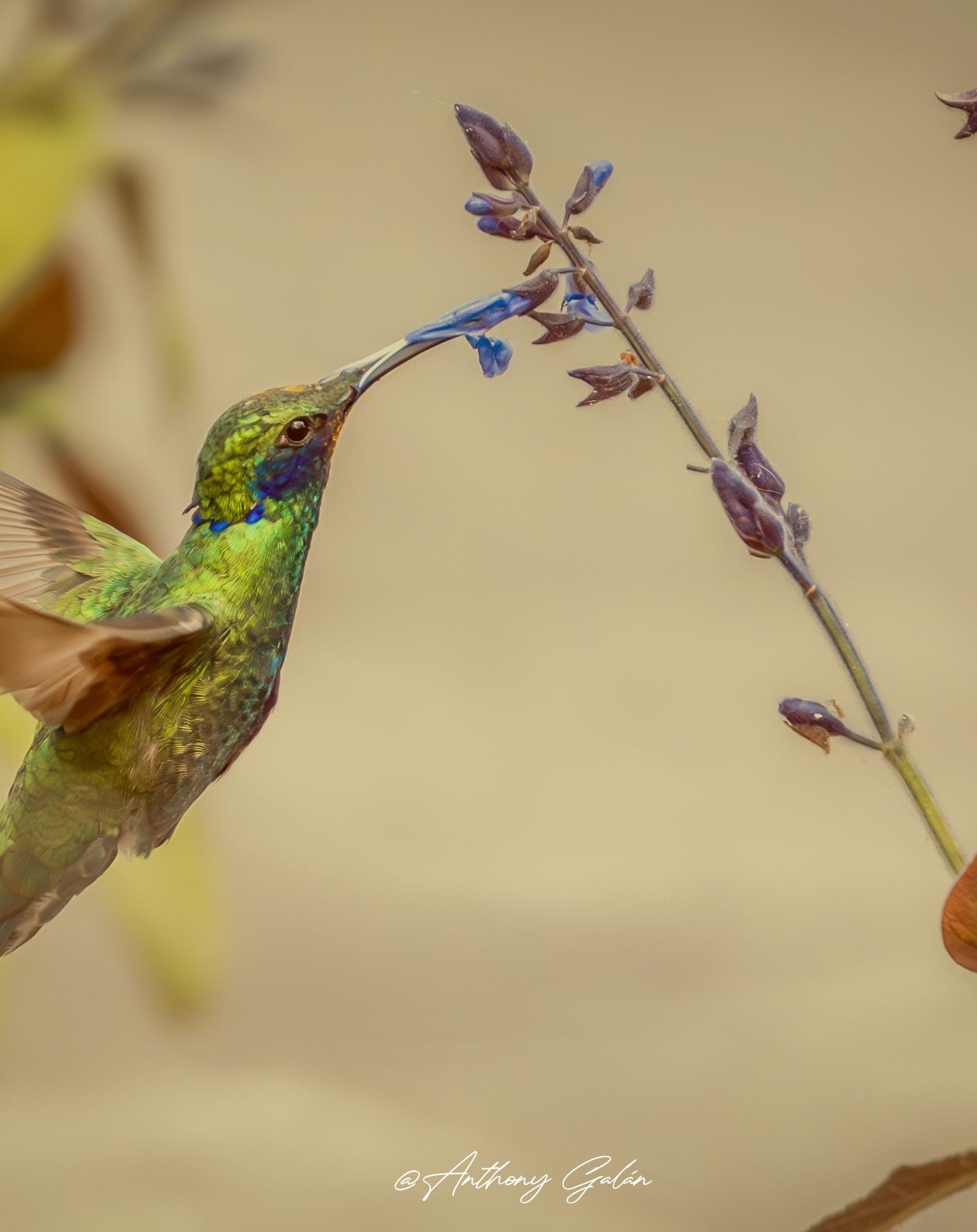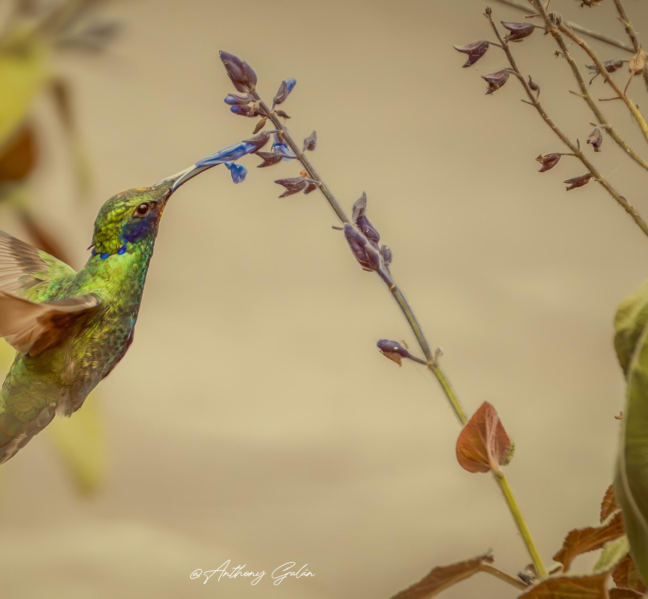 3 y 4 En el Campus Central de la UCuenca se identificaron colibríes coruscans alimentándose en flores azules de salvia y en las de color naranja, conocidas como farol chino.