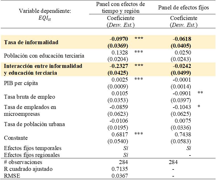 Aunque el país ha avanzado en la expansión del acceso a la educación superior, la formación universitaria a menudo no responde a las demandas del mercado laboral. Esto genera un desajuste que obliga a muchos jóvenes con títulos universitarios a aceptar empleos informales o subempleados, agravando la precariedad laboral. En un estudio econométrico en desarrollo (Tabla 3), encontramos que, en la población joven del Ecuador, la informalidad afecta negativamente la calidad del empleo, resultando preocupante que la educación en lugar de mitigar este efecto, la potencia.