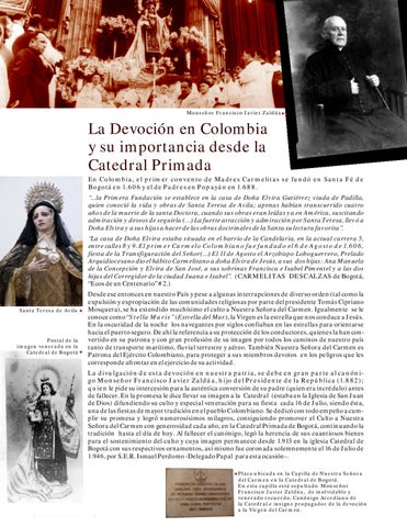 La Devoción en Colombia y su importancia desde la Catedral Primada En Colombia, el primer convento de Madres Carmelitas se fundó en Santa Fé de Bogotá en 1.606 y el de Padres en Popayán en 1.688. “...la Primera Fundación se establece en la casa de Doña Elvira Gutiérrez viuda de Padilla, quien conoció la vida y obras de Santa Teresa de Avila; apenas habían transcurrido cuatro años de la muerte de la santa Doctora, cuando sus obras eran leídas ya en América, suscitando admiración y deseos de seguirla (…) La fuerte atracción y admiración por Santa Teresa, llevó a Doña Elvira y a sus hijas a hacer de las obras doctrinales de la Santa su lectura favorita”. “La casa de Doña Elvira estaba situada en el barrio de la Candelaria, en la actual carrera 5, entre calles 8 y 9. El primer Carmelo Colombiano fue fundado el 6 de Agosto de 1.606, fiesta de la Transfiguración del Señor(…) El 11 de Agosto el Arzobispo Loboguerrero, Prelado Arquidiocesano dio el hábito Carmelitano a doña Elvira de Jesús, a sus dos hijas: Ana Manuela de la Concepción y Elvira de San José, a sus sobrinas Francisca e Isabel Pimentel y a las dos hijas del Corregidor de la ciudad Juana e Isabel”. (CARMELITAS DESCALZAS de Bogotá, “Ecos de un Centenario” #2.)