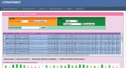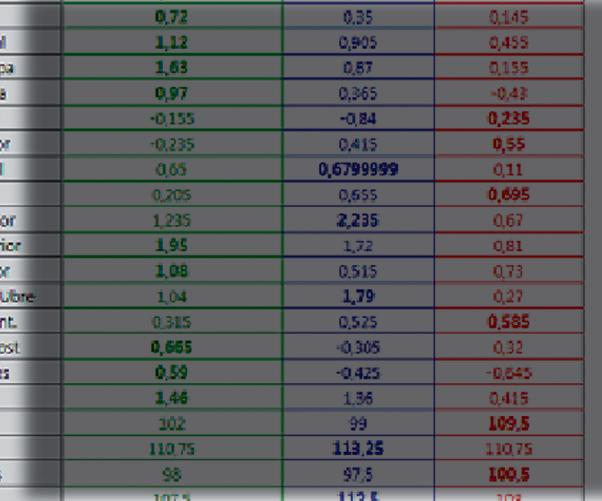 Los porcentajes indican el flujo de leche, de tal manera que cuando aumenta el nivel de vacío en el colector incrementa la velocidad de ordeño. Por otro lado cuando incrementa el tiempo de duración de la fase “b” de ordeño incrementa también la velocidad de ordeño hasta cierto límite y a partir de ahí disminuye la velocidad de ordeño debido al incremento de congestión del pezón. El color indica el grado de congestión de los pezones, siempre en el caso de que sean pezones largos, sobre unos 37 mm, de tal manera que penetran dentro de la zona de compresión de la pezonera. El color verde indica una baja congestión, el amarillo una congestión media, el rosa una alta congestión y el color mo-