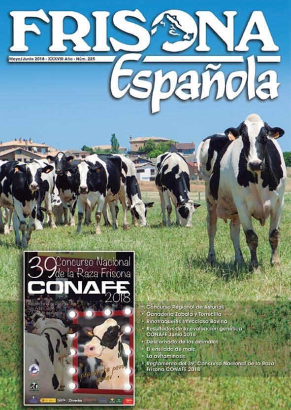 Etiquetado de la leche y productos lácteos: opinión de los representantes de COAG y Cooperativas agro-alimentarias 32 CONAFE • Mejores hembras de la evaluación Junio’18 36 • Club de Producción Vitalicia 37 GENÉTICA • Evaluación Genética Junio’18 - Clun se mantiene como líder de toros españoles y extranjeros J Pena 42 - Catálogo de Sementales.........................................................44 - 50 Mejores vacas por ICO 54 - Mejores explotaciones por ICO 56 • Evaluaciones genómicas de las mejores novillas genómicas con edad inferior a 18 meses 59 • Nueva evaluación genética para Salud Podal en España N Char feddine y Mª A Pérez Cabal 62 • Nuevos toros en reparto 66 ESCUELA DE JUECES SOBRE PAPEL • Resultados sección 83ª .................................................................72 • Sección 84ª 73 CALIFICACIÓN • Animales calificados EX y MB durante los meses de marzo y abril de 2018 74 CONTROL LECHERO • Resultados del Control Lechero 2017 88 ANEMBE RESPONDE • Realización del descor nado L Ferreria 92 TEMARIO • Uso de antibióticos en granjas lecheras N. García y F. Díaz ...........................................................................94 • Micotoxinas: riesgos para los rumiantes. A Gallo y E Trevisi 96 • Un problema de vitaminas J V González 100 • Conservación de forrajes (VI): ensilado de maíz A Callejo 104 y además... • Reglamento del 39º Concurso Nacional de la Raza Frisona CONAFE’18 112 • Guía Comercial 118 • Índice de anunciantes ...............................................................118 y Mayo/Junio 2018 nº 225