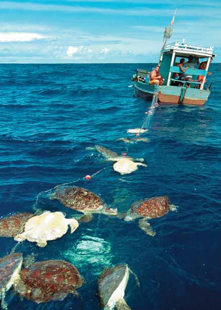 Entre as modalidades pesqueiras que mais dizimam tartarugas está a pesca industrial, com utilização de espinhel pelágico. Realizada em alto-mar, dificulta a ação de organismos fiscalizadores e registra altos índices de capturas incidentais. A poluição marinha representa outro fator que gera enorme impacto na vida desses animais. A tartaruga é pouco seletiva em relação a sua alimentação. Com poucas papilas gustativas na língua, ela come o que vê pela frente. A ingestão de plástico, por exemplo, pode causar obstrução no sistema digestivo, impedindo-as de defecar; as fezes vão endurecendo devido à perda de água, e o animal muitas vezes morre. Também o derramamento de derivados de petróleo nos mares pode provocar efeitos deletérios na fauna marinha. Composto extremamente tóxico, o óleo pode ser fatal se for ingerido por uma tartaruga.