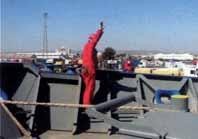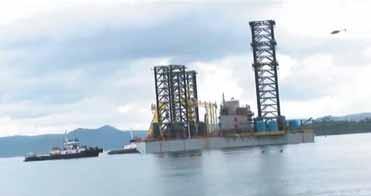 Loading the rig onto the raft took about fifteen hours and was carefully monitored to ensure that everything was done as safely as possible. Subject to tide changes and receiving the weight of the jplatform progressively, the ballast was constantly compensated.in order to ensure its alignment with the structure upon which the self-raising unit was built. Finally, once it had been moved into a pre-established position, the rig slid onto the raft until it stabilized floatin g. The final operation took only ten seconds, crowning the efforts of years of planning. The undertaking was carried out with the support of the Brazilian Navy and locally by the Bahian Port Authorities.