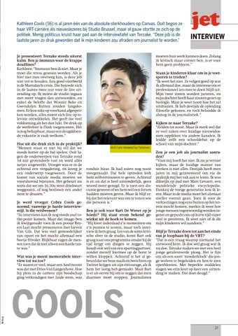 Je presenteert Terzake steeds uiterst kalm. Ben je immuun voor de krappe deadlines? Kathleen: “Immuun ben ik niet. Maar je moet die stress gewoon worden. Als je hier niet mee overweg kan, is deze job niet vol te houden. Een goed voorbeeld is de Marrakech-crisis. Die bouwde zich in de laatste twee uur voor de live uitzending op. Ik moest de studio ingaan met meer vragen dan antwoorden, en enkel de belofte dat Wouter Beke en Gwendolyn Rutten zouden langskomen. Er kon niks op voorhand afgesproken worden, alles moest zich live op televisie ontwikkelen. Het geeft me veel voldoening als het dan lukt. De druk op de werkvloer is f link toegenomen. Het is nog behapbaar, maar een deugddoende vakantie is vaak welkom.” Hoe uit die druk zich in de praktijk? “Mensen staan er niet bij stil dat we steeds korter op de bal spelen. Ooit lagen de onderwerpen van Terzake rond 14 uur grotendeels vast en werd alles netjes uitgewerkt. Vroeger was er in de ochtend een vergadering, en kreeg je een onderwerp toegewezen. Door de komst van sociale media moeten we voortdurend bijsturen. Het gebeurt nu soms dat we om 16.30u weer driekwart weggooien, of nog beslissen een ander item te draaien.” Je werd vroeger Cobra Cools genoemd, vanwege je harde interviewstijl. Is die verdwenen? “In interviews kan ik nog steeds snel tothe-point komen. Maar dat imago ben ik kwijtgeraakt toen ik een poosje Reyers Laat mocht presenteren met Lieven Van Gils. Dat was veel gemoedelijker van opzet en het mocht allemaal een beetje frivoler. Blijkbaar zagen de mensen toen dat ik niet alleen een harde tante was.” Wat was je meest memorabele interview tot nu toe? “Er waren er veel, maar een heel recent was dat met Dries Van Langenhove. Hoe hij plots in de camera zijn boodschap ging verkondigen met luide stem, was