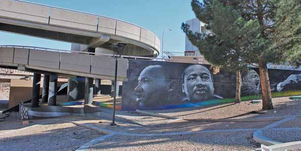 interpretation of history, such as the representational mural just completed at the Wheels Museum by artist Ryan Saveedra, or Mountain Top, the Martin Luther King Jr. tribute mural on Tijeras