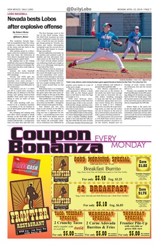 This weekend, Nevada baseball accomplished what the Lobos could not — take the rubber match of the series and get back in the Mountain West race. After getting swept in a threegame series by conference leaders San Jose State, the University of New Mexico baseball team found itself facing an uphill climb. But playing host to the visiting Wolf Pack, who came to Albuquerque with a 6-9 conference record gave the Lobos hope that they could make an upward move. Instead, the Lobo baseball team sits alone in last place in the MW standings. Nevada and UNM split the first two games, making Sunday's matchup even more pivotal — with the winner holding an opportunity to catapult into fifth place in the conference. New Mexico (16-19, 7-11 MW) got off to a good start, turning a double play on defense in the first inning and getting back-to-back doubles from Jared and Connor Mang to seize an early 1-0 lead through one. The Lobo pitching staff continued to be a strikeout machine — recording 13 Ks on Sunday to see its three-game punch out total swell to 40. But swinging and missing early and often wasn't enough to derail Nevada, as the Wolf Pack took full advantage of when they did make contact with the ball — scoring more runs (14) than they had hits (12).