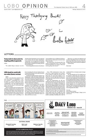 LETTER SUBMISSION POLICY Letters can be submitted to the Daily Lobo office in Marron Hall or online at DailyLobo.com. The Lobo reserves the right to edit letters for content and length. A name and phone number must accompany all letters. Anonymous letters or those with pseudonyms will not be published. Opinions expressed solely reflect the views of the author and do not reflect the opinions of Lobo employees.