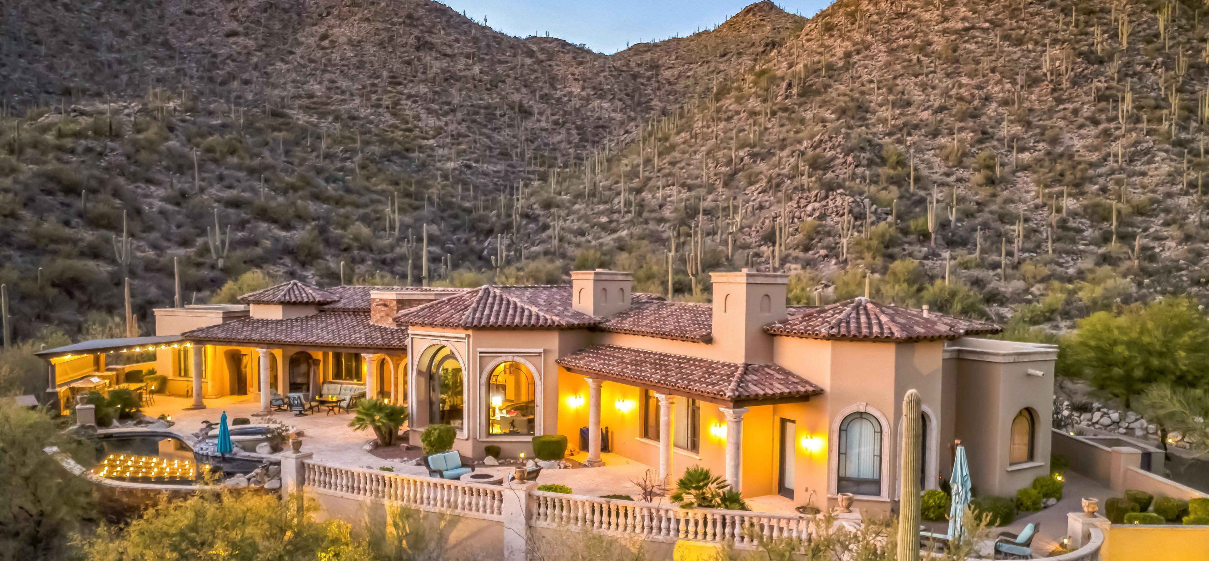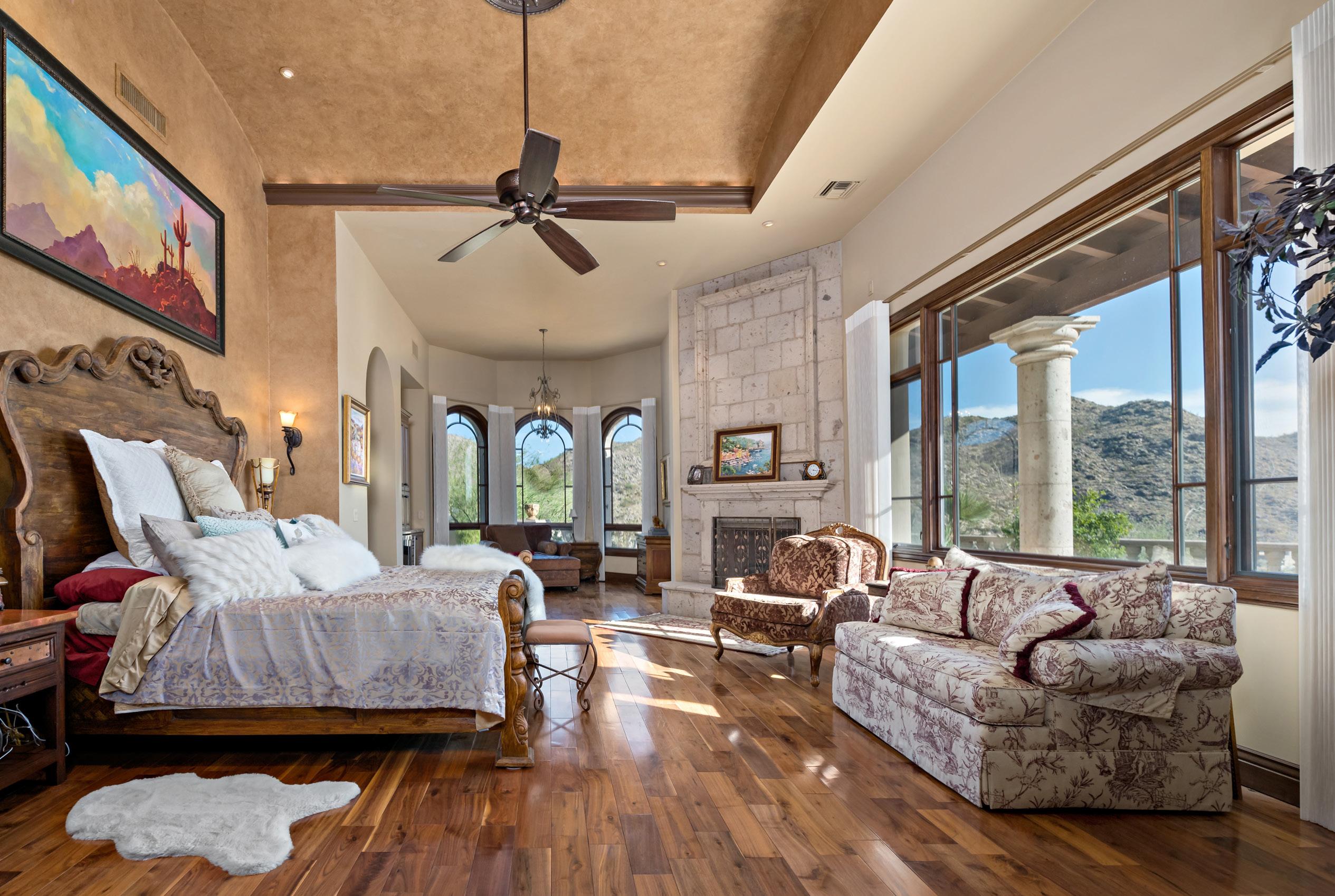 Perched on one-and-a-half acres, the estate commands panoramic views of soaring saguaros and monumental mountain ranges. Twelve-foot handcrafted metal doors open to an impressive gathering room defined by arched windows and a dramatic fireplace. European-inspired details emerge through Florentine ceiling techniques, cantera stone elements, and exquisite natural stone flooring.