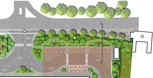 An enhanced public realm following an exciting landscaping design Layered landscape buffer with