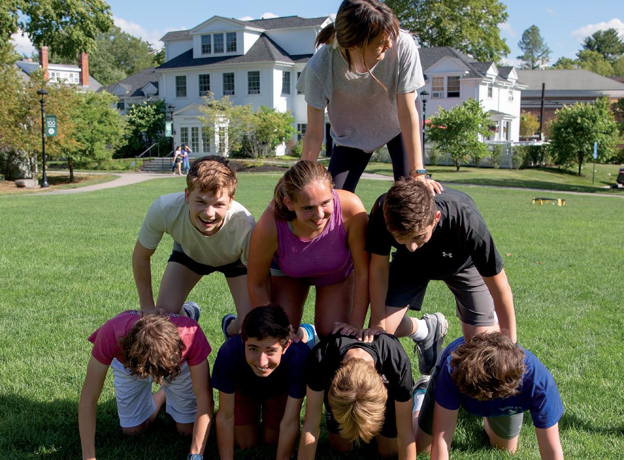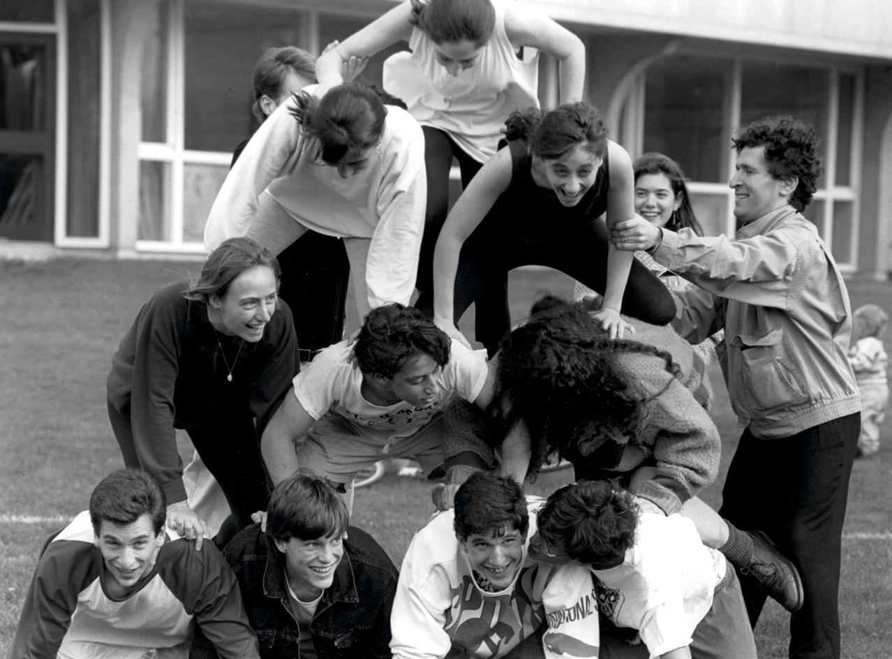 THEN: During the 1990–91 school year, students form a human pyramid with the help of Richard Colton P’13, then co-director of the dance program.