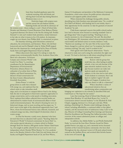 former CA headmaster and president of the Baltimore Community bout three hundred graduates spent the Foundation, which raises money for public-private educational weekend reuniting with old friends and initiatives and supports public school reform. reliving their Concord days during Reunion Wilcox lamented the challenges facing public schools, Weekend, June 15 to 17. describing how little freedom some principals enjoy. “In a world of Festivities began with campus tours No Child Left Behind, with funding tied to test results, there is and the annual Art and Author Exhibit, little opportunity for the creativity we take for granted at Concord featuring books and artwork by alumnae/i of Academy,” he said. the reunion years—those ending in 2 and 7. Head of School Jake Clark-Suazo expressed concern that public school teachers Dresden and Alumnae/i Council Reunions Chair Rebecca Watriss have had to become more focused on meeting standards “just to ’95 greeted alumnae/i for dinner in the Stu-Fac dining hall. Freddie get things done” than on great teaching. “Teaching is not as Tunnard ’07, last year’s student body president, treated alumnae/i creative anymore in a lot of classrooms,” she said. She described to her take on what it means to be a CA student. As classmates one Washington, DC elementary school whose principal eliminated caught up over dessert, Jean Phillips Kelly ’52 entertained on piano. social studies and limited science to twenty minutes a week. On Saturday morning, panel discussions centered on “Teachers are sneaking it in,” she said. Part of the reason Clarkeducation, the environment, and literature. Those who did their Suazo changed to a private school was “to recapture that desire to homework and read In Pharaoh’s Army by Tobias Wolff stepped continue teaching,” she said, “and it’s worked so far.” back into the classroom for a book group led by Dean of Faculty Hult agreed with Clark-Suazo’s observations. “You’re Sandy Stott and English Department Head Liz Bedell. observed to make sure you’re using the curriculum the right way,” Others discovered what steps CA is taking to make the he said. “It’s hard to find time to talk about something for more campus more environmentally friendly. New Academic Dean John than twenty minutes.” Drew led a discussion, “A Greener Rostow told the group that Campus and a Greener World,” with small class size, often lacking in public Candy Cox Dann ’72, recycling schools, is key not only because of the coordinator for the Massachusetts extra attention students receive, but Department of Environmental also because teachers can make sure Protection; Johanna Rosen ’97, students speak out repeatedly on cofounder of an urban farm in Philasubjects, to the class and to each other. delphia; and David Santomenna ’82, “I ask students to comment, then I ask director of land conservation for them to explain it again,” she said. the Essex County (Massachusetts) “That can’t happen if students have Greenbelt Association. PHOTOS BY TIM MORSE only one chance to talk in a classroom.” Emma Posner ’07 told the Wilcox described a variety of group about an audit that evaluated educational initiatives that are CA’s energy use, and explained that the transforming urban communities and school wants to take immediate small bringing new optimism to city schools; he described Hult and steps, such as its decision to compost leftover food in the dining Clark-Suazo as “the hope for our nation.” hall, but also to seek grants to fund more expensive approaches to Later that morning, Head of School Jake Dresden and energy conservation, such as solar panels or building renovation. trustees Peter Blacklow ’87 and Mark Rosen p’97, ’06 led “A Drew explained that dollars collected from recycled bottles are Conversation about Concord Academy” in the Elizabeth B. Hall administered by student heads of environmental affairs to fund Chapel, engaging alumnae/i in a lively give-and-take. While small environmental projects. The school is focusing for now on praising a flourishing CA, Dresden noted challenges facing the behavioral change, such as more recycling and less paper use. “I school, including affordability, a continued ability to hire gifted don’t want to lose sight of the educational opportunity here,” said teachers, and the increased stress of adolescence today. Later in the Drew, whose Environmental Science class collected, measured, and day, Director of College Counseling Peter Jennings and Associate evaluated energy-use data, which helped CA determine where it Head for Enrollment and Planning Pam Safford provided a frank wastes energy. overview of the current admissions picture at colleges and In what has become a yearly event, alumnae/i who have independent schools. devoted their lives to education held a panel, “Teaching Today for In addition, Kay Muller Bullitt ’42 and Phyllis Rothschild Tomorrow’s World.” It featured commentary by Jason Hult ’02, Farley ’42 received the Joan Shaw Herman Award for Distinwho teaches special education at a charter school in Harlem guished Service (see page 44), and a memorial service honored through Teach for America; fifth-grade teacher Trelane Clark-Suazo members of the Concord Academy community who have died. ’92, who taught in public schools for ten years and is now in an Throughout the day, alumnae/i swam in CA’s pool, played tennis, independent school; Heyden White Rostow ’67, p’08, academic canoed on the Sudbury River, and revisited their favorite haunts dean at the Brearley School in New York City and former dean of in the town of Concord. faculty and English Department head at CA; and Tom Wilcox,