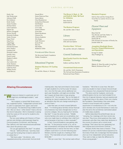 e have an interest in a particular sort of bright but unchallenged student,” said the woman. Her husband, a retired Wall Street executive, explained further: “Independent schools tend to cater to superstars from upper- and lowerincome groups. The late-blooming middle-income kid — like our niece — often doesn’t have a shot at this kind of education. We’re interested in seeing what four years at CA can do for students who fit that profile.” The two were talking with Director of Financial Aid John McGarry and Associate Head for Communications, Enrollment, and Planning Pam Safford, who had interviewed and admitted their niece the previous year. “Do you get applicants like that?” he asked. “We do,” Safford affirmed, “and they tend not to get the funding they’d need to attend CA or a place like it.” “We have a plan,” the donors, who requested anonymity, announced. And one brief