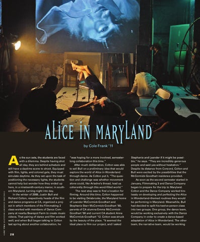 “was hoping for a more involved, semesterlong collaboration this time.” After much deliberation, Colton was able to sell Bull on a preliminary idea that would explore the world of Alice in Wonderland through dance. As Colton put it, “The question and challenge was whether movement alone could, like Ariadne’s thread, lead us coherently through this word-filled world.” The next step was to find a location for filming. Around this time, Colton happened to be visiting Delabrooke, the Maryland home of Leander McCormick-Goodhart and Stephanie Starr McCormick-Goodhart ’80, parents of CA alumna Emma McCormickGoodhart ’08 and current CA student Anna McCormick-Goodhart ’12. Colton was struck by the beauty of the place. “It seemed the ideal place to film our project, and I asked