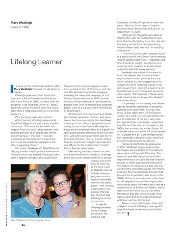 n a twist on the traditional academic path, Mary Wadleigh followed her daughter to college. Wadleigh graduated from Smith College with a BA in Environmental Science and Public Policy in 2007, six years after her daughter, Alice Wadleigh Jayne ’97, graduated from Smith and more than forty years after Mary’s 1964 graduation from Concord Academy. Why the long break from school? After Concord, Wadleigh did enroll at Radcliffe College but it was a time of political turmoil. “This was the era when the campus was shut down by protesters, and political activism of all stripes was rife on and off campus,” she said. “I was distracted by all that and knew I wasn’t performing to the academic standards I and others expected of me.” Ultimately, Wadleigh left Radcliffe but a lifelong interest in both politics and environmental science had started. Vowing to complete a degree someday, she taught Earth