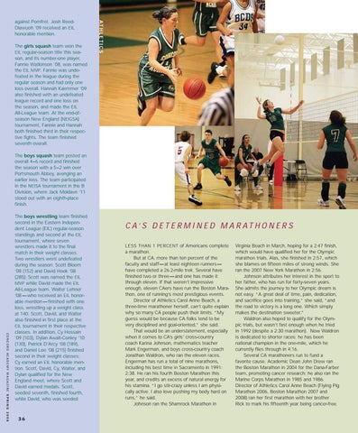 Virginia Beach in March, hoping for a 2:47 finish, which would have qualified her for the Olympic marathon trials. Alas, she finished in 2:57, which she blames on fifteen miles of strong winds. She ran the 2007 New York Marathon in 2:56. Johnson attributes her interest in the sport to her father, who has run for forty-seven years. She admits the journey to her Olympic dream is not easy. “A great deal of time, pain, dedication, and sacrifice goes into training,” she said, “and the road to victory is a long one. Which simply makes the destination sweeter.” Waldron also hoped to qualify for the Olympic trials, but wasn’t fast enough when he tried in 1992 (despite a 2:30 marathon). Now Waldron is dedicated to shorter races; he has been national champion in the one-mile, which he currently flies through in 4:16. Several CA marathoners run to fund a favorite cause. Academic Dean John Drew ran the Boston Marathon in 2004 for the Dana-Farber team, promoting cancer research; he also ran the Marine Corps Marathon in 1985 and 1986. Director of Athletics Carol Anne Beach (Flying Pig Marathon 2006, Boston Marathon 2007 and 2008) ran her first marathon with her brother Rick to mark his fifteenth year being cancer-free.