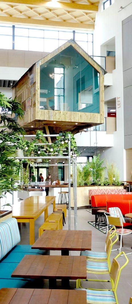 Could this be the ideal office building? For the fortunate 500 employees who have access to amenities like a village pub and a treehouse, it just might be. The office space features a treehouse meeting room, Moneypenny’s own village pub, a sun terrace, and a triple-height atrium with stadium seating, exuding character and innovation at every turn. The full design and CAT B fit-out have been completed with precision, ensuring that the space is not only aesthetically pleasing but also highly functional, catering to the diverse needs of a dynamic workforce. The workspace is engineered for both comfort and productivity, offering a harmonious blend of leisure and work areas.