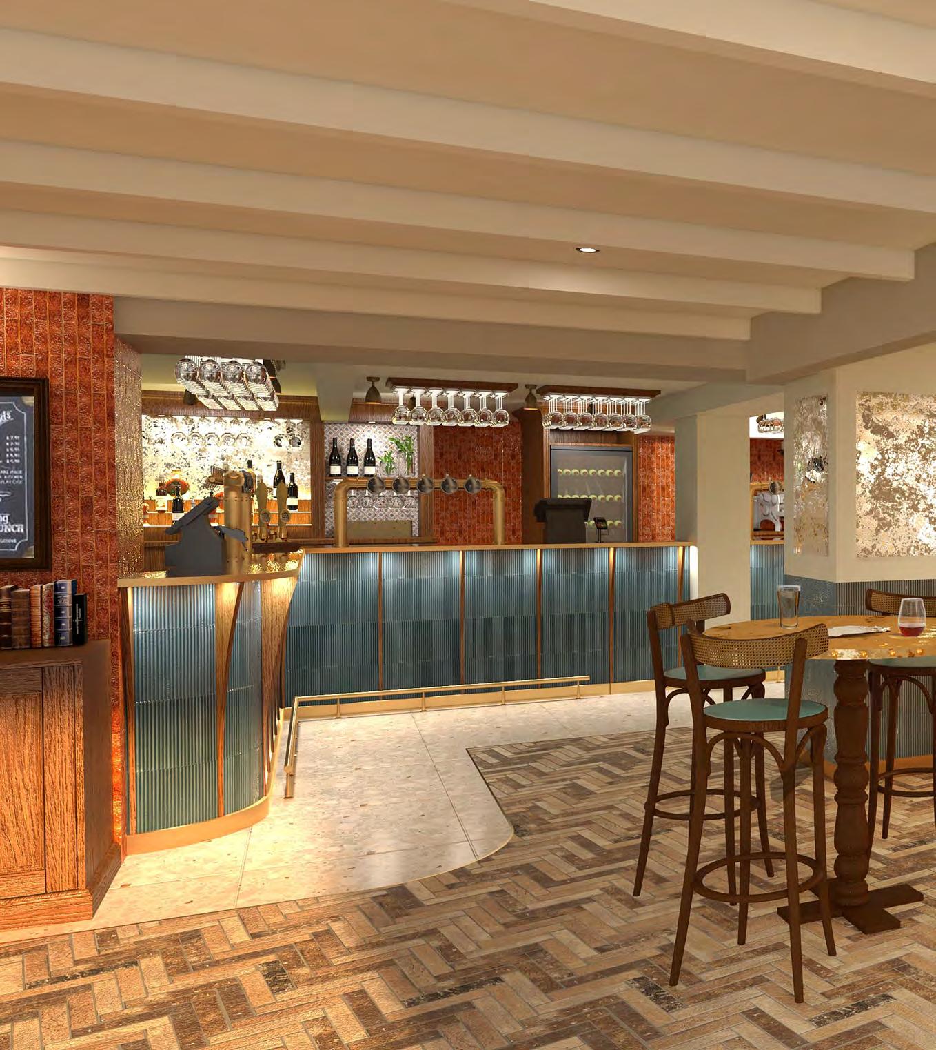 The current horseshoe-shaped bar disrupts the flow of the space and occupies a large footprint. Replacing it with a more traditional, in-keeping design will open up the area and create more efficient and accessible staff stations.