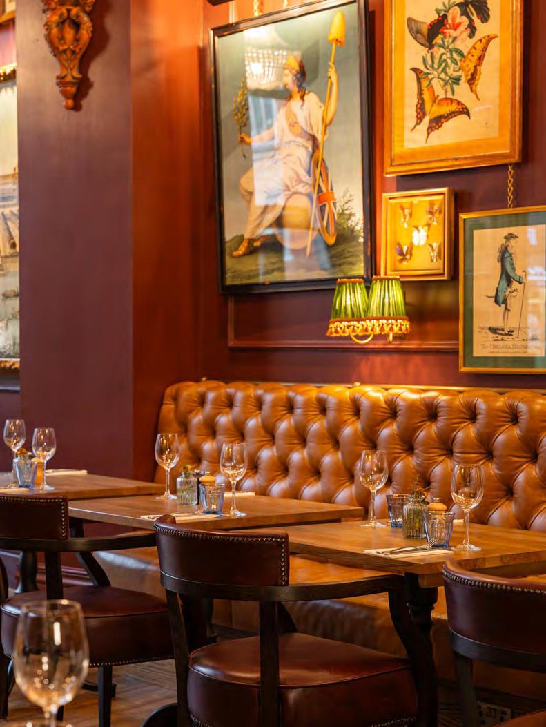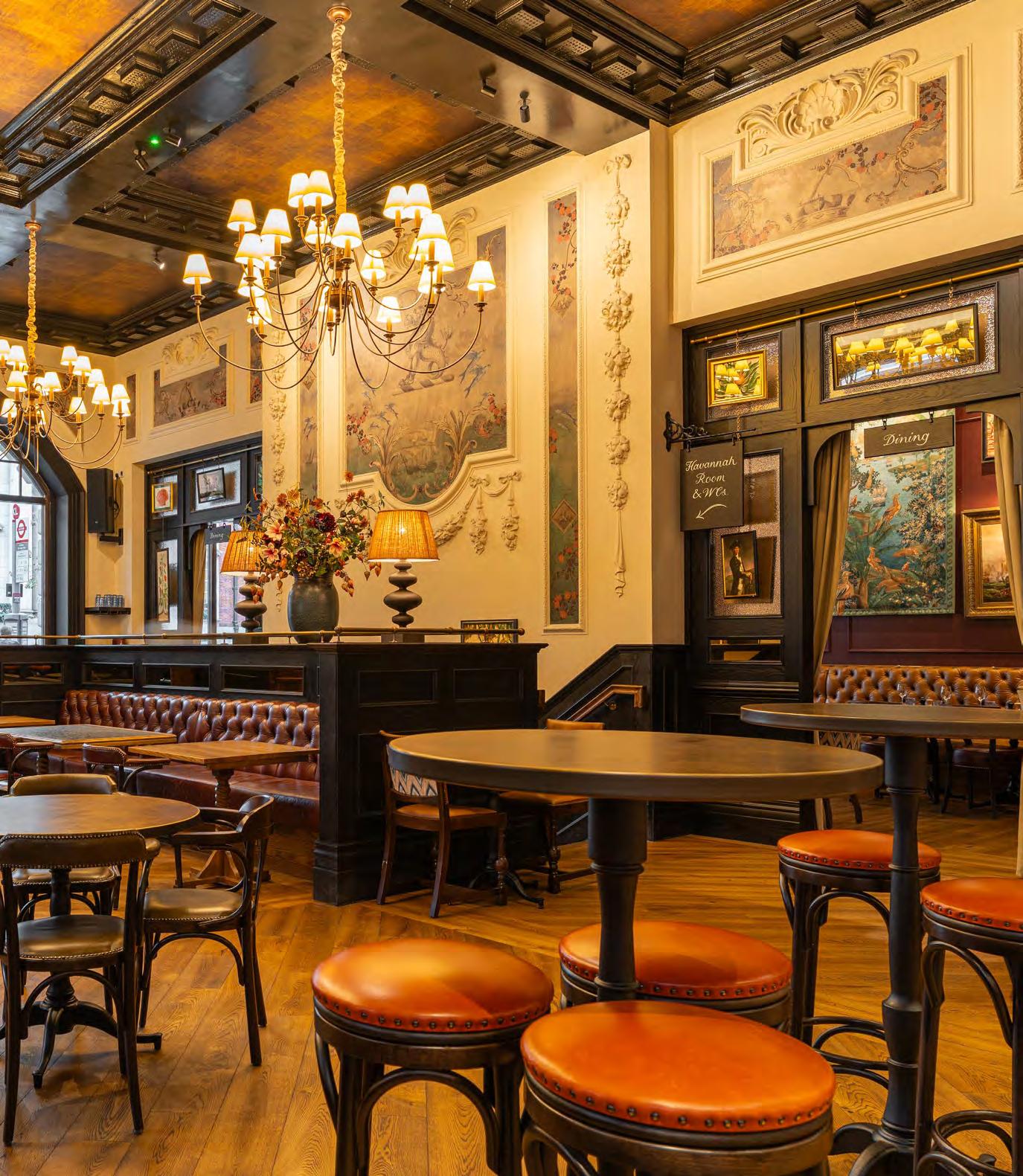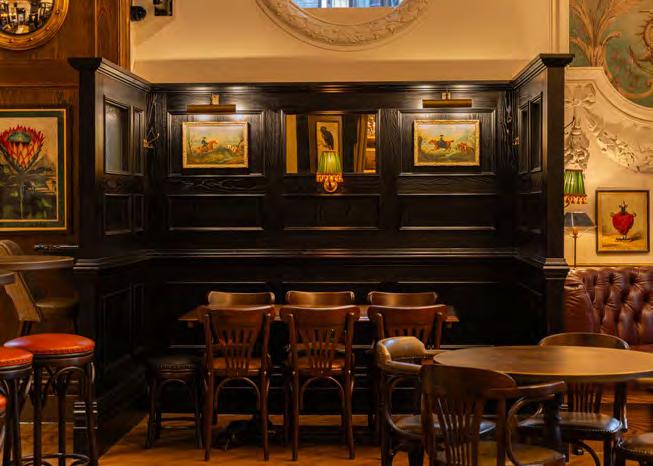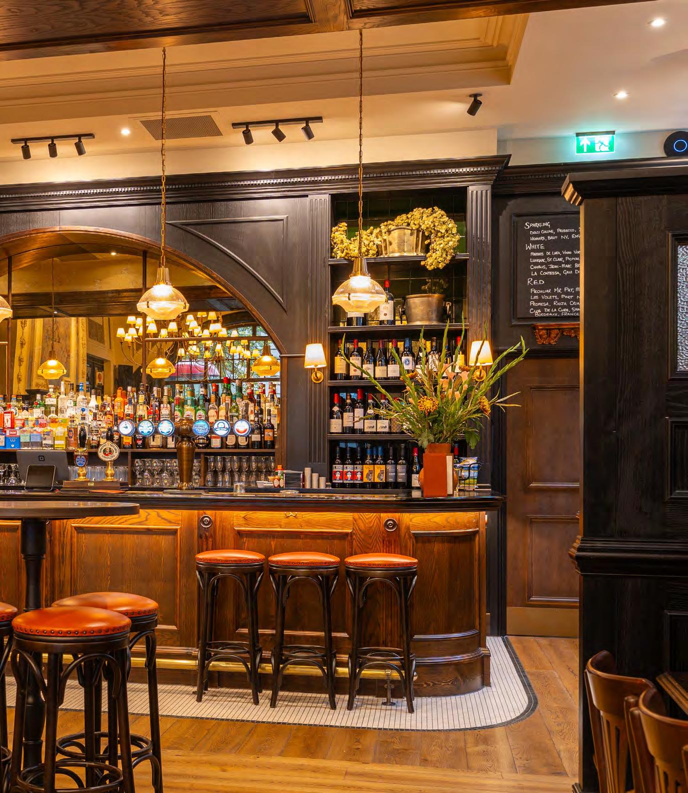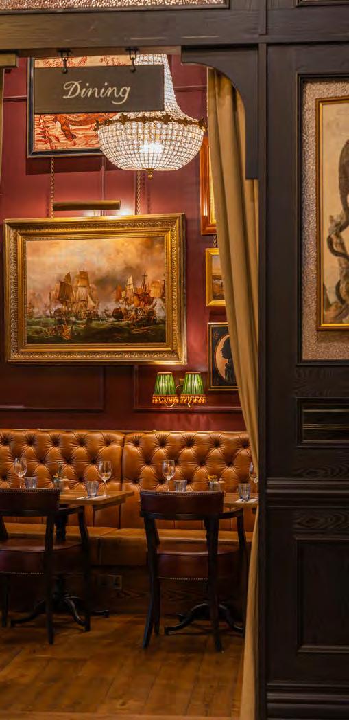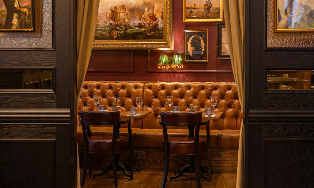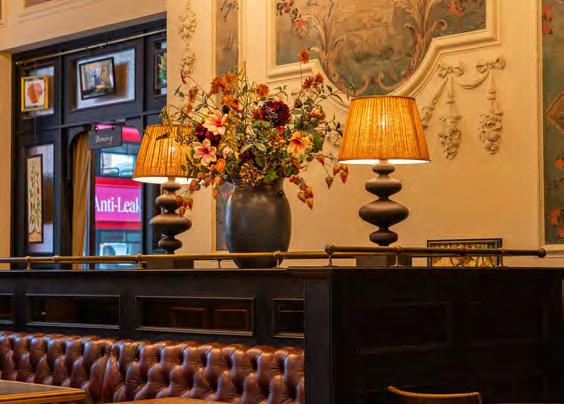 As guests enter through the main lobby into the Old Banking Hall, a space defined by its impressive five-metre-high agedbronze ceilings, four grand chandeliers and bespoke wallpaper framed by original festoon plasterwork. Vintage artwork, historic banking documents and oversized feature lamps create an atmosphere that feels both elegant and timeless. Restored Georgian windows and ornate plaster detailing sit harmoniously alongside the warm new interior scheme, which introduces an impressive central bar, intimate booth seating, leather dining chairs and striking statement chandeliers. Together, these elements highlight the hall’s Edwardian character while offering a welcoming contemporary experience.