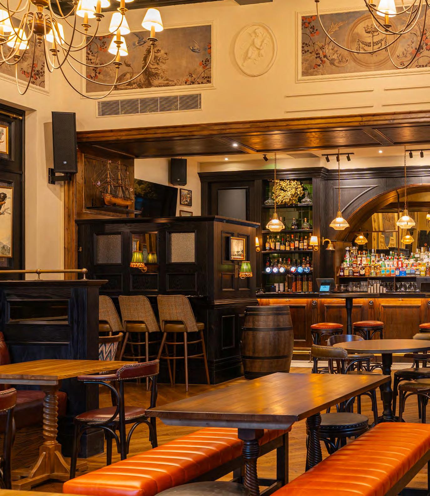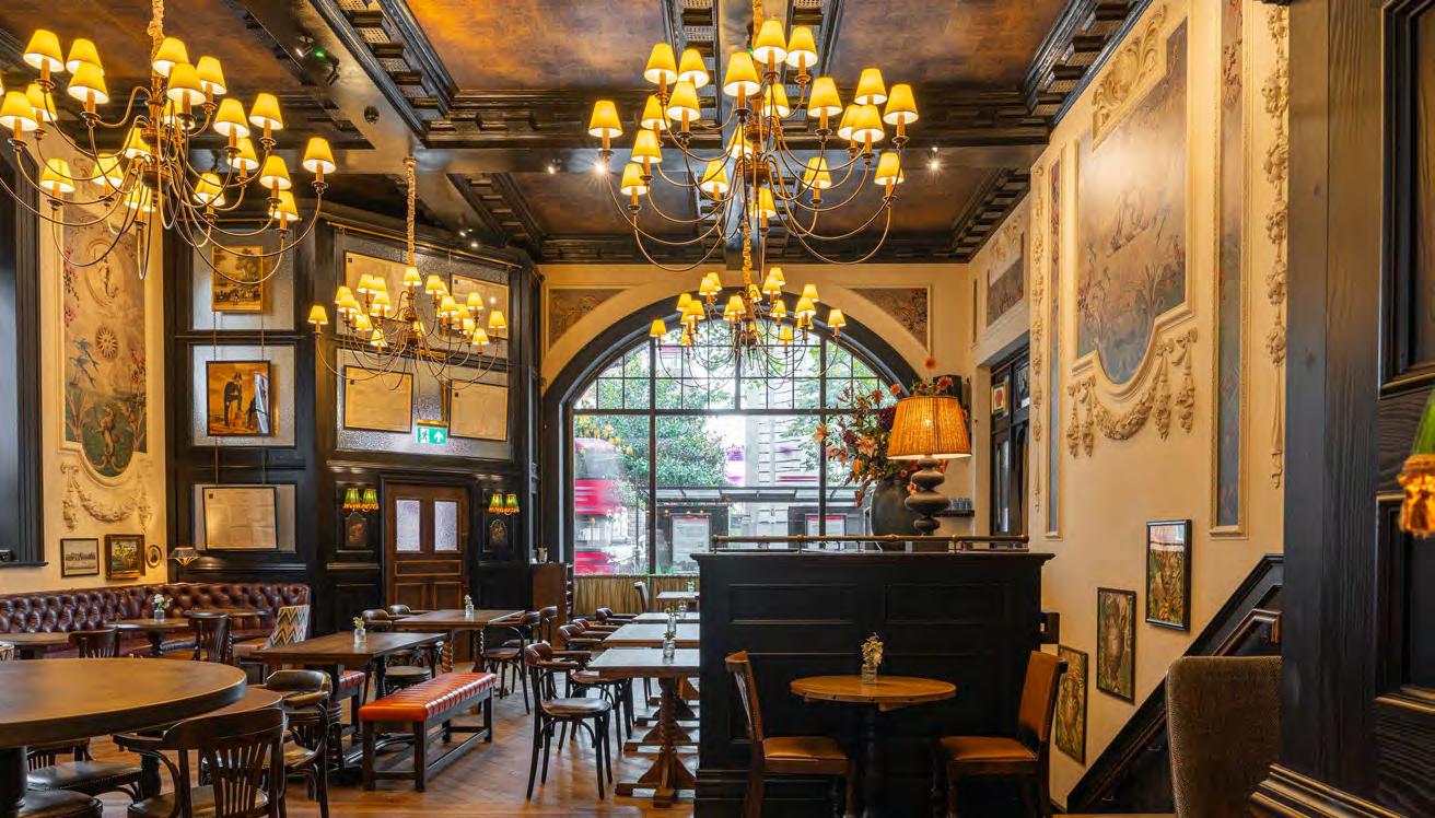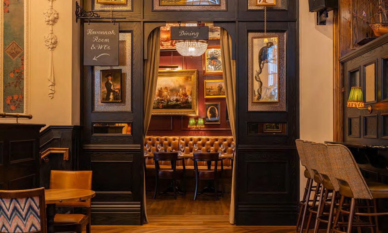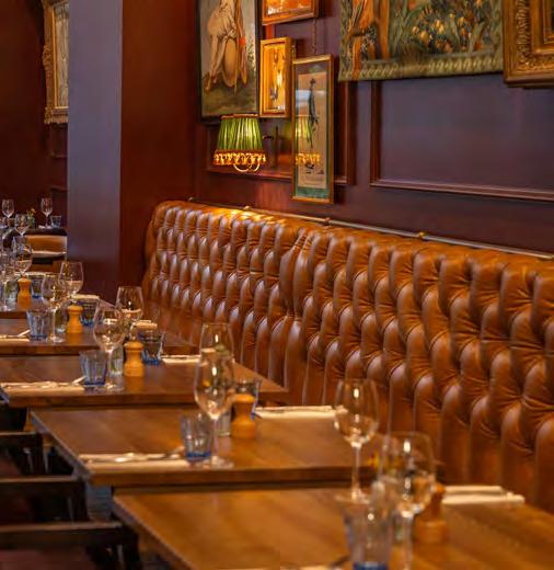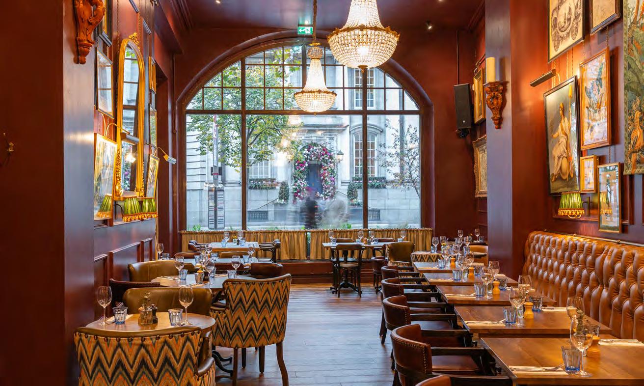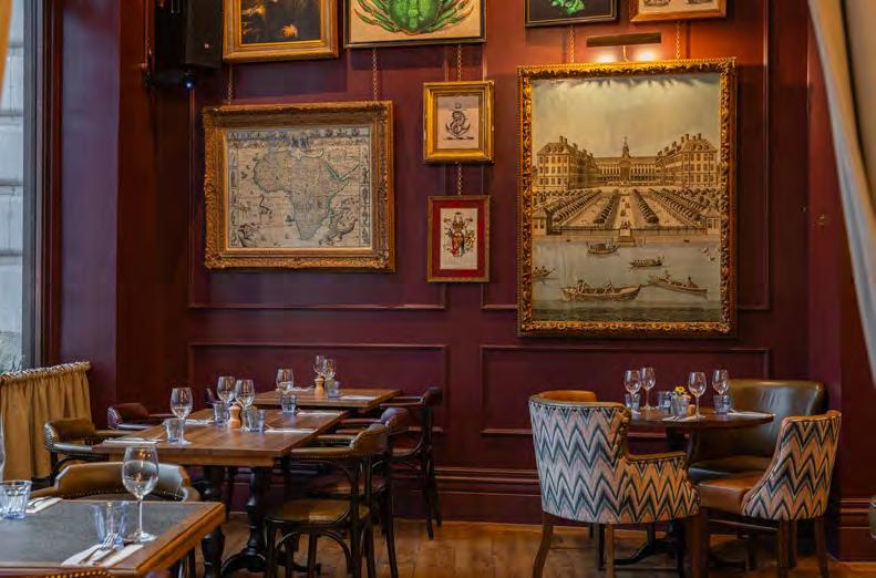 As guests enter through the main lobby into the Old Banking Hall, a space defined by its impressive five-metre-high agedbronze ceilings, four grand chandeliers and bespoke wallpaper framed by original festoon plasterwork. Vintage artwork, historic banking documents and oversized feature lamps create an atmosphere that feels both elegant and timeless. Restored Georgian windows and ornate plaster detailing sit harmoniously alongside the warm new interior scheme, which introduces an impressive central bar, intimate booth seating, leather dining chairs and striking statement chandeliers. Together, these elements highlight the hall’s Edwardian character while offering a welcoming contemporary experience.