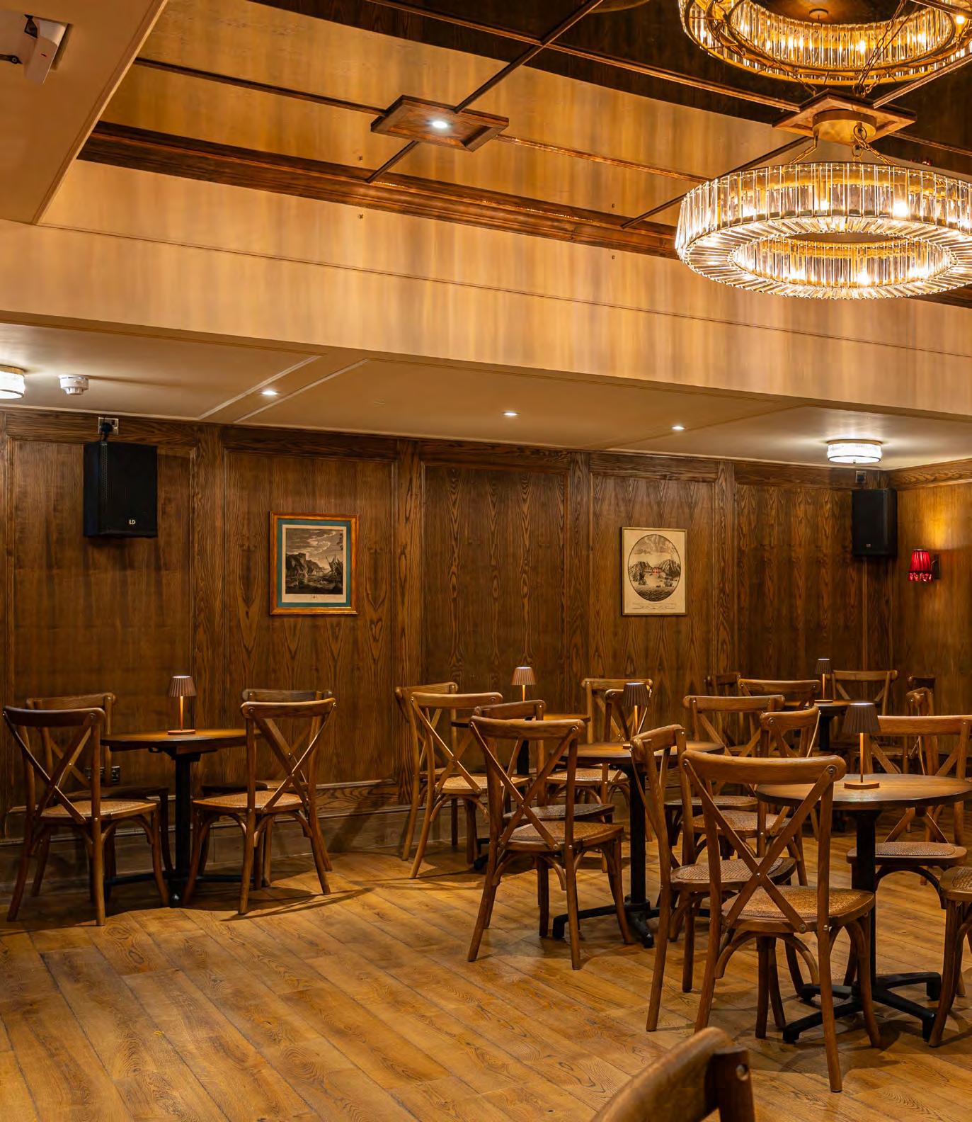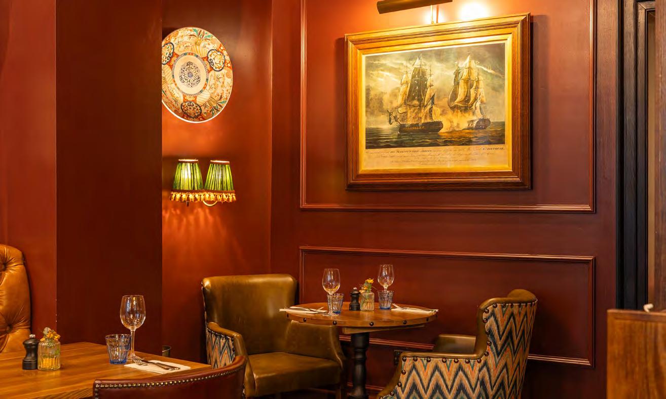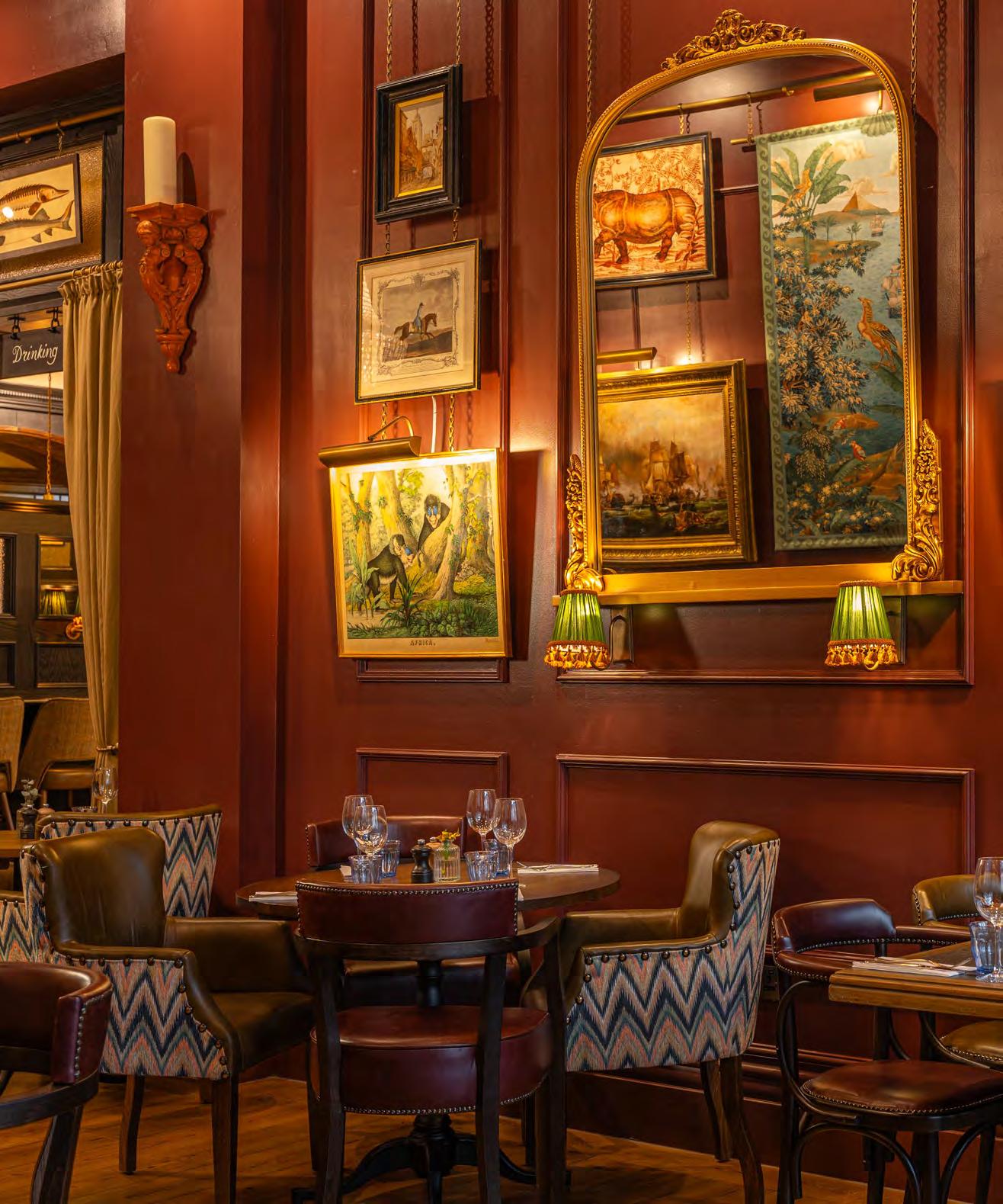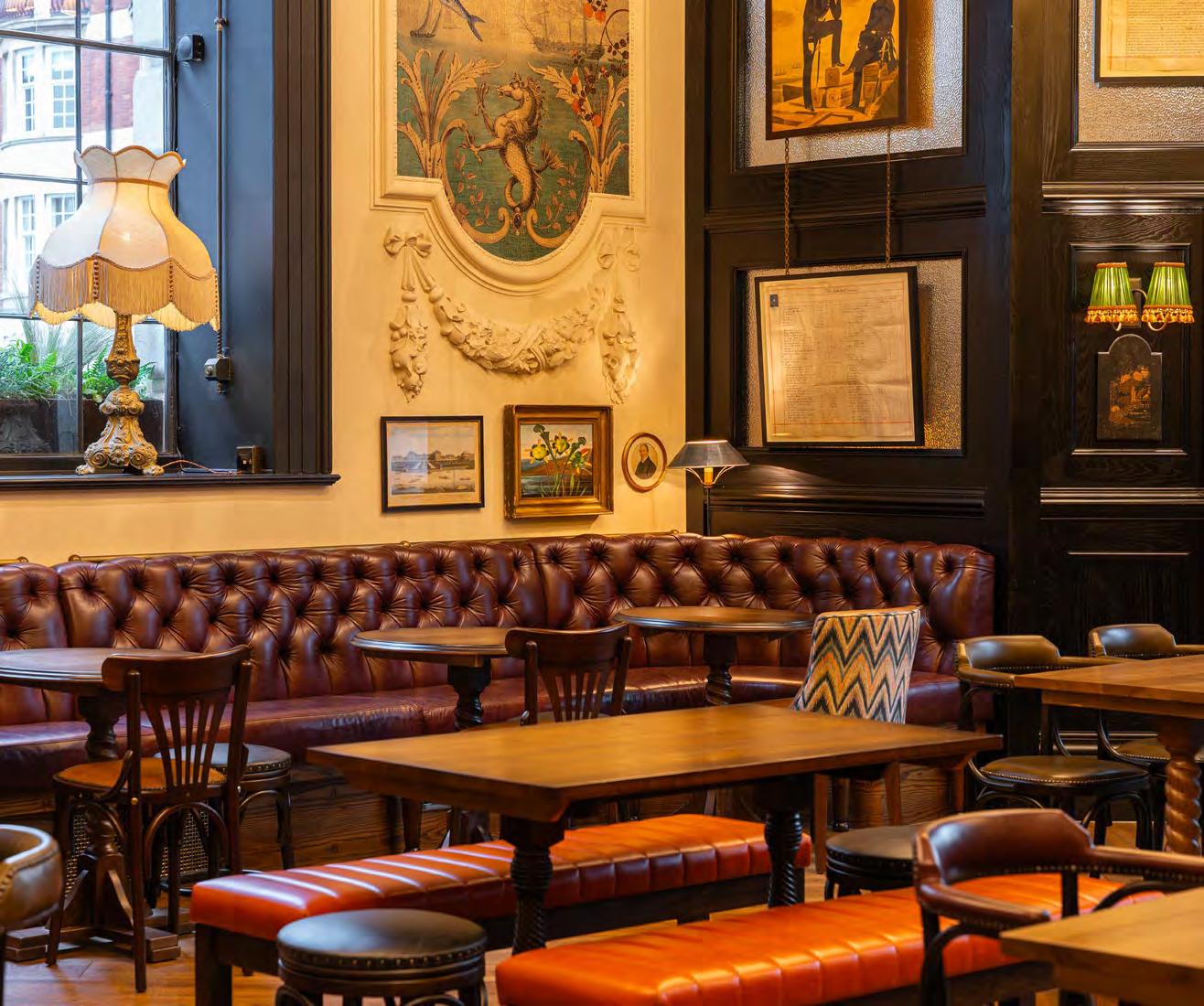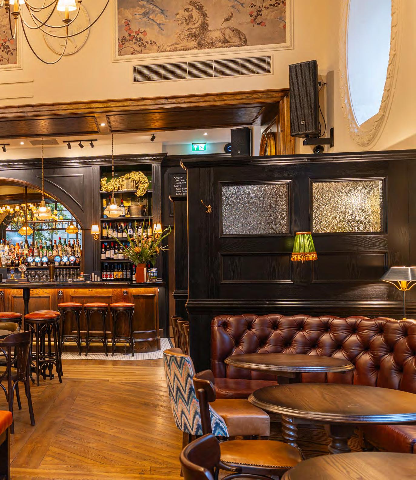 As guests enter through the main lobby into the Old Banking Hall, a space defined by its impressive five-metre-high agedbronze ceilings, four grand chandeliers and bespoke wallpaper framed by original festoon plasterwork. Vintage artwork, historic banking documents and oversized feature lamps create an atmosphere that feels both elegant and timeless. Restored Georgian windows and ornate plaster detailing sit harmoniously alongside the warm new interior scheme, which introduces an impressive central bar, intimate booth seating, leather dining chairs and striking statement chandeliers. Together, these elements highlight the hall’s Edwardian character while offering a welcoming contemporary experience.